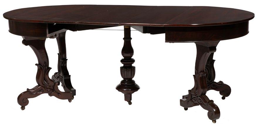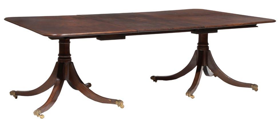 415. Georgian Mahogany Two-Pedestal Extension Dining Table, 19th c., molded top, turned standard, reeded out-swept legs, brass feet, casters, two leaves, 28 x 52 1/2 x 61 1/4 in. (71.1 x 133.4 x 155.6 cm.), extension 28 x 52 1/2 x 109 1/2 in. (71.1 x 133.4 x 278.1 cm.) [$1,200 - 1,800]