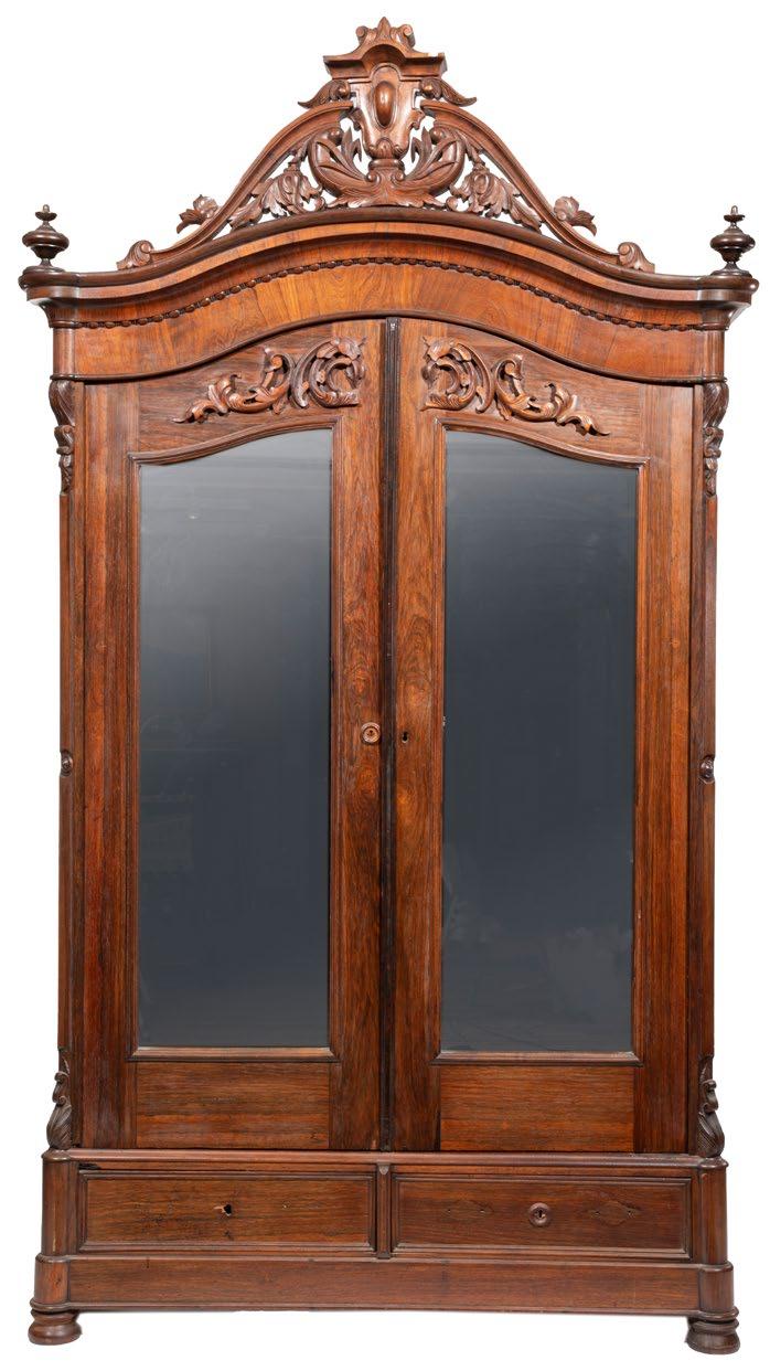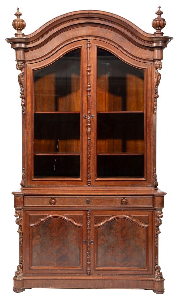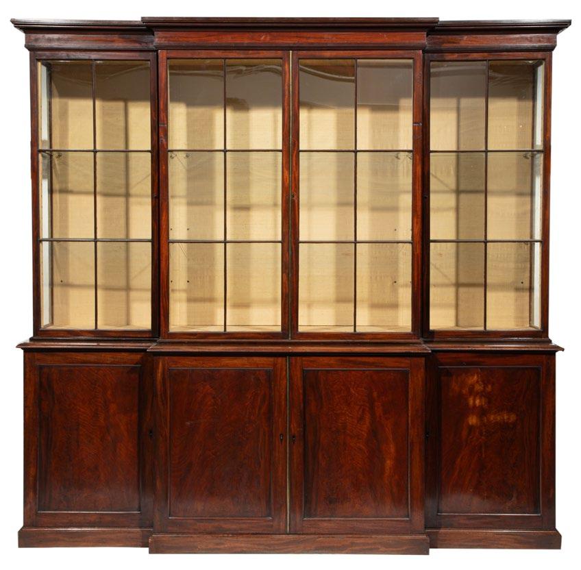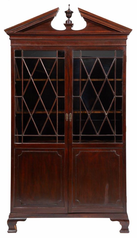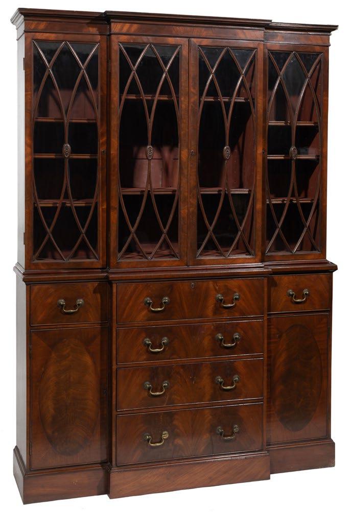 414. Georgian-Style Carved Mahogany Bookcase, late-19th c., molded broken arched pediment, glazed and molded panel doors, bracket feet, 93 x 22 x 48 in. (236.2 x 55.9 x 121.9 cm.) [$800 - 1,200]