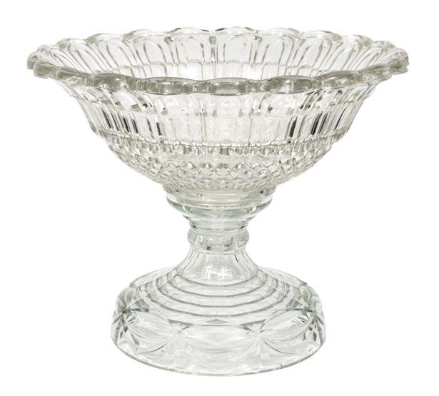 67. A Monumental American Molded Flint Glass Punch Bowl, mid 19th c., scalloped rim bowl with quilted and arched patterns, on a ringed pedestal with drapery motif on edge of base, h. 18 in., dia. 21 1/2 [$800 - 1,200