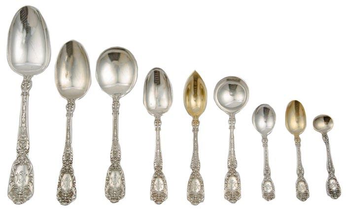29. Extensive Gorham “Florentine” Pattern Sterling Silver Flatware Service, pat. 1901, designer William C. Codman, incl. 12 each: forks (l. 7 3/4 in.), forks (l. 7 1/4 in.), knives (hh, silverplate blades, l. 9 5/8 in.), fish knives (fh), fruit knives (hh), butter knives (fh), pie forks, ice cream forks, cocktail forks, dessert spoons, cream soup spoons, bouillon spoons, ice cream spoons, citrus spoons, chocolate spoons and demitasse spoons; 11 knives (hh, silverplate blades, l. 8 1/2 in.), 14 fish forks, 10 salad forks, 11 berry forks, 6 tablespoons, 24 teaspoons, and 6 master salt spoons; 274 pcs. total. Total weight (weighable) 372.35 troy ozs. [$5,000 - 7,000]
