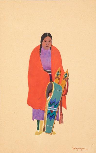 70. Stephen (Qued Koi) Mopope, Cáuigú/Oklahoma, 1898-1974, “Mother with Child in Cradleboard”, gouache on paper, signed lower right, unframed. 10 7/8 x 6 7/8 in. (27.6 x 17.5 cm.)