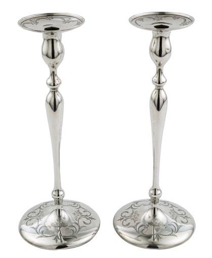 33. Shreve and Co. Sterling Silver Table Candlesticks, act. 1852 to present, probably mid-20th c., No. 7679, elongated baluster form with engraved scrolls and flowers, removable bobeches, loaded bases. H. 15 1/8 in. [$300 - 500]