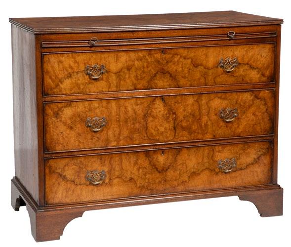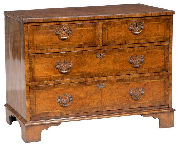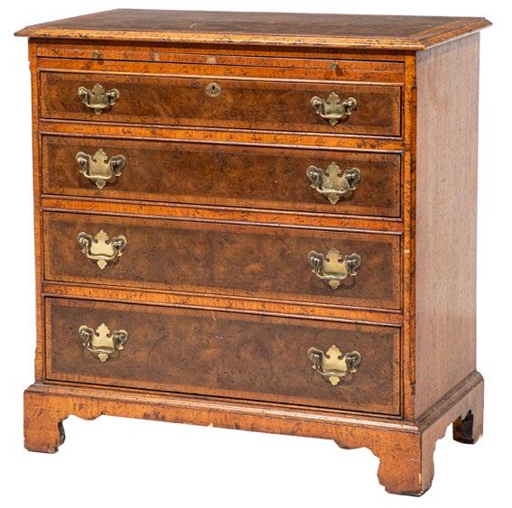 44. George III-Style Burl Walnut Chest of Drawers, 19th c., molded banded top, banded two short drawers over two long drawers, bracket feet, 28 1/4 x 19 1/2 x 37 1/2 in. (71.8 x 49.5 x 95.3 cm.)