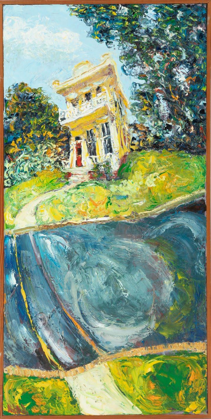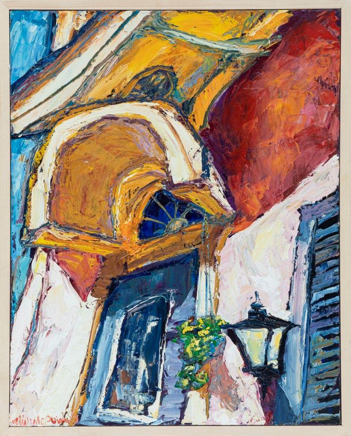 403. James Michalopoulos, American/Louisiana, b. 1951, “Segment by Celia’s”, oil on canvas, 1994, signed lower left, signed “Mitchell”, “Michalopoulos” and dated en verso, titled, inscribed “2253” and artist card with title on stretcher, framed. 30 x 24 in. (76.2 x 61 cm.), Frame: 31 1/2 x 25 1/2 x 1 3/4 in. (80 x 64.8 x 4.4 cm.)