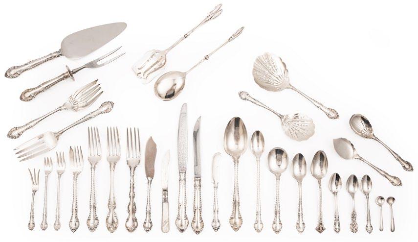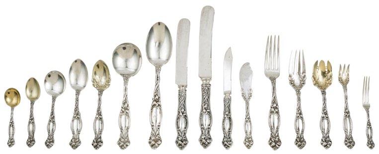 25. International “Frontenac” Pattern Sterling Silver Flatware Service, pat. 1903, designer John Clulee, incl. 12 each: forks (l. 7 1/2 in.), knives (hh, l. 9 7/8 in.), knives (hh, l. 9 in.), fruit knives (hh), butter knives (fh), bouillon spoons, ice cream forks, strawberry forks, demitasse spoons, chocolate spoons; 18 cream soup spoons, 11 cocktail forks, 11 salad forks, 11 ice cream spoons, 26 teaspoons, 6 tablespoons, asparagus server, berry spoon (l. 9 in.), 2 cold meat forks (l. 8 3/4 in.), salad serving spoon (l. 8 7/8 in.), jelly server, 2 master butter knives, cheese scoop, sardine fork, horseradish spoon, olive fork, pickle fork, mustard ladle, butter pick and sugar tongs, 219 pcs. total, total weight (weighable) 190.15 troy ozs.