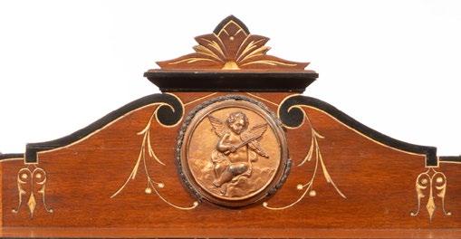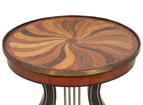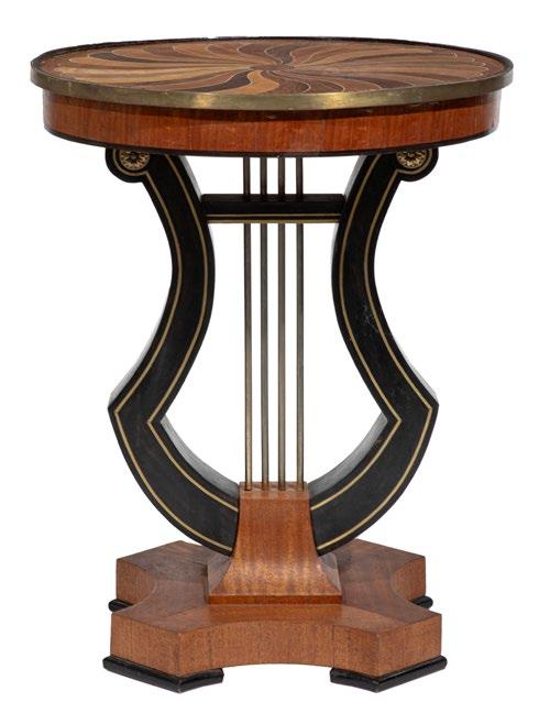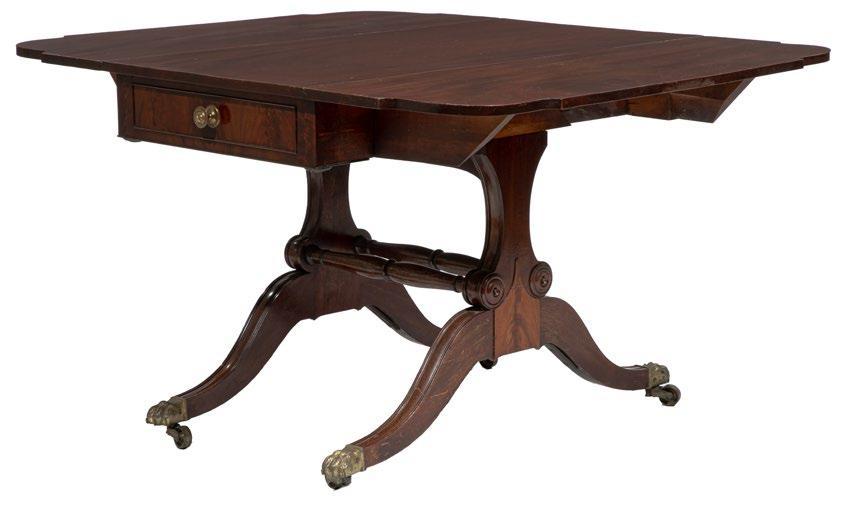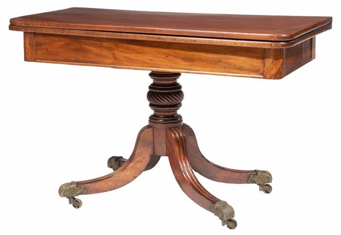 408. Regency Inlaid Mahogany Game’s Table, 19th c., after a design by Thomas Hope, fold over top, scrolled tablet frieze, reeded standard, incurvate plinth, out swept legs, brass feet, castors, 29 1/2 x 35 x 17 1/2 in. (74.9 x 88.9 x 44.5 cm.), Open 29 1/2 x 35 x 35 in. (74.9 x 88.9 x 88.9 cm.) [$700 - 1,000]