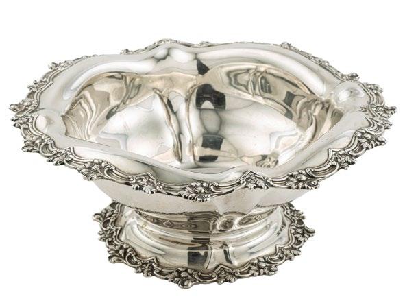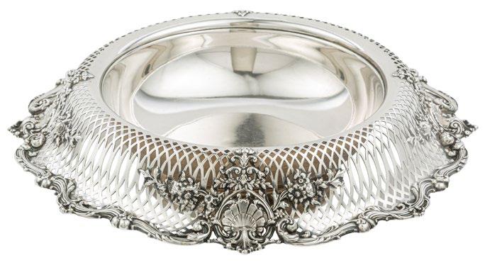 18. American Sterling Silver Center Bowl, probably 1st half 20th c., everted reticulated rim with cast shells, scrolls and small bouquets, H. 3 1/2 in., diameter 13 1/2 in., weight 30.30 troy ozs. [$700 - 1,000]