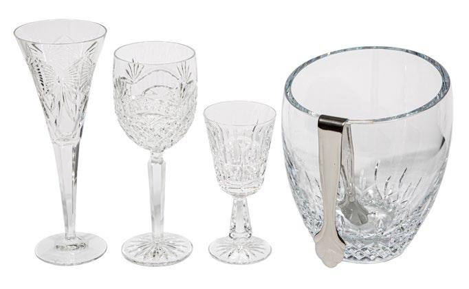 57. Waterford Crystal “Lismore” Ice Bucket and Pairs of Stemware, marked, incl. ice bucket. h. 8 in.; pair of “Kylemore” goblets, h. 6 in.; pair of “Artisan” wine glasses, h. 8 1/2 in.; and pair of “Millennium” champagne flutes, h. 9 1/4 in. (8 pcs.) [$300 - 500]