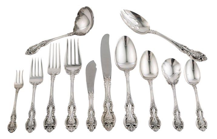 27. Wallace “Grand Victorian” Sterling Silver Flatware Service, pat. 1973, incl. 12 each: dinner forks (l. 8 1/8 in.), dinner knives (hh, l. 9 3/4 in.), salad forks and teaspoons; 14 dessert spoons, 5 cocktail forks, 2 tablespoons, pierced tablespoons, cold meat fork, sugar shell, master butter knife (hh) and gravy ladle; 74 pcs. total; total weight (weighable) 115.30 troy ozs. [$2,000 - 4,000]