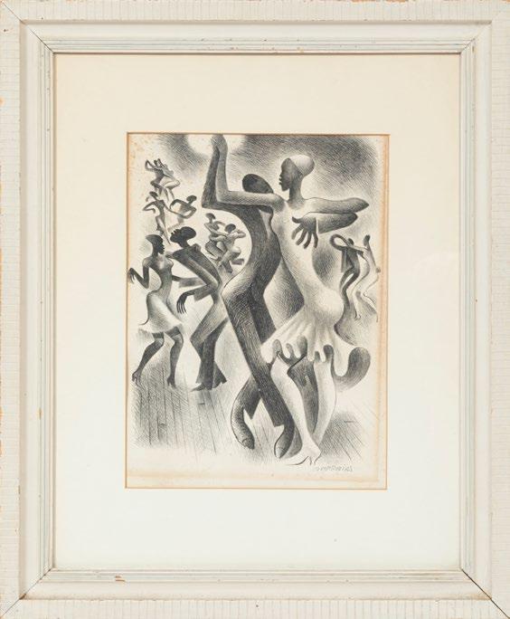 76. Miguel Covarrubias, Mexican, 1904-1957, “The Lindy Hop”, lithograph, 1936, pencil-signed lower right, framed. Sheet: 17 3/4 x 12 3/4 in. (45.1 x 32.4 cm.), Frame: 23 1/4 x 19 1/8 x 1 in. (59.1 x 48.6 x 2.5 cm.) [$800 - 1,200]