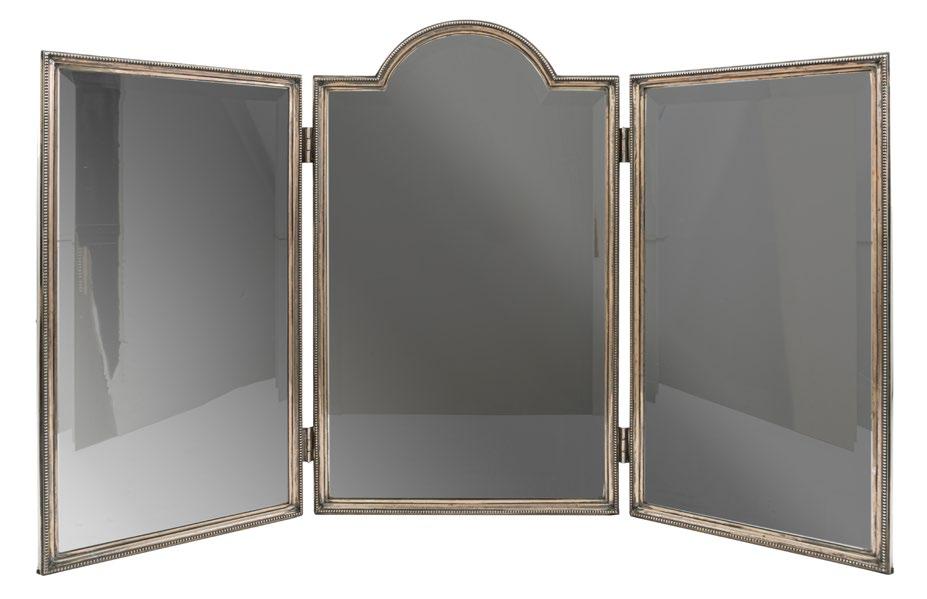 Dressing Table Mirror, probably early 20th c., marked “Cartier”, “STERLING” and “925-1000”, beveled mirror plates inset in molded surrounds with beaded borders, central arched panel h. 21 in., w.13 in., flanking panels h. 18 3/4 in., w. 10 in.