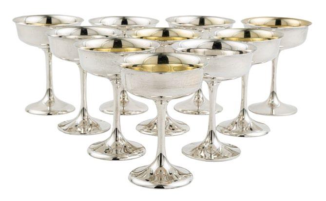 32. Set of Ten Shreve and Co. Sterling Silver Champagne Coupes, act. San Francisco 1852 to present, probably c. 1960, No. 8944, gilt wash interiors, loaded bases. H. 5 in. [$800 - 1,200]