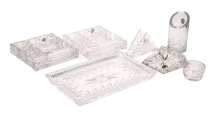 65. Group of Waterford Crystal Desk Accessories, marked, incl. 2 “Great Barr ington” desk organizers, l. 6 1/4 in.; “Lismore” letter holder, h. 3 1/4 in.; “Dorset” Post-It Note holder, l. 5 in.; “Lismore Essence” pen holder, h. 5 in.; “Glenmore” dish, dia. 2 5/8 in.; and “Lismore” tray, l. 11 1/4 in., w. 7 in. (7 pcs.)