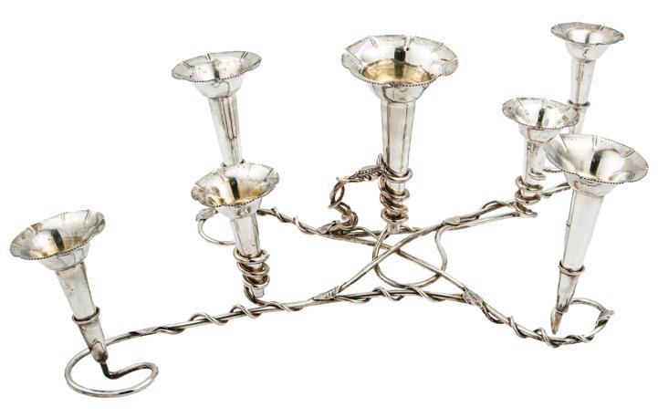 23.Vintage Silverplate Trumpet Epergne, serpentine rose leaf and vine base fitted with removable trumpet vases, overall h. 8 3/4 in., l. 25 1/4 in., w. 17 1/4 in. [$400 - 600]