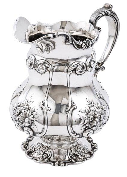 19. Good American Sterling Silver Water Pitcher, Theodore B. Starr, New York, NY, act. 1877-1924, no. 4457, paneled vase form with floral and scroll repousse, C-scroll handle, spreading foot, h. 9 in., weight 30.20 troy ozs. [$700 - 1,000]