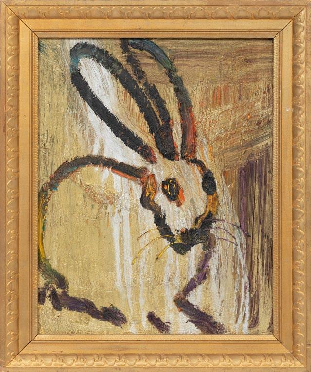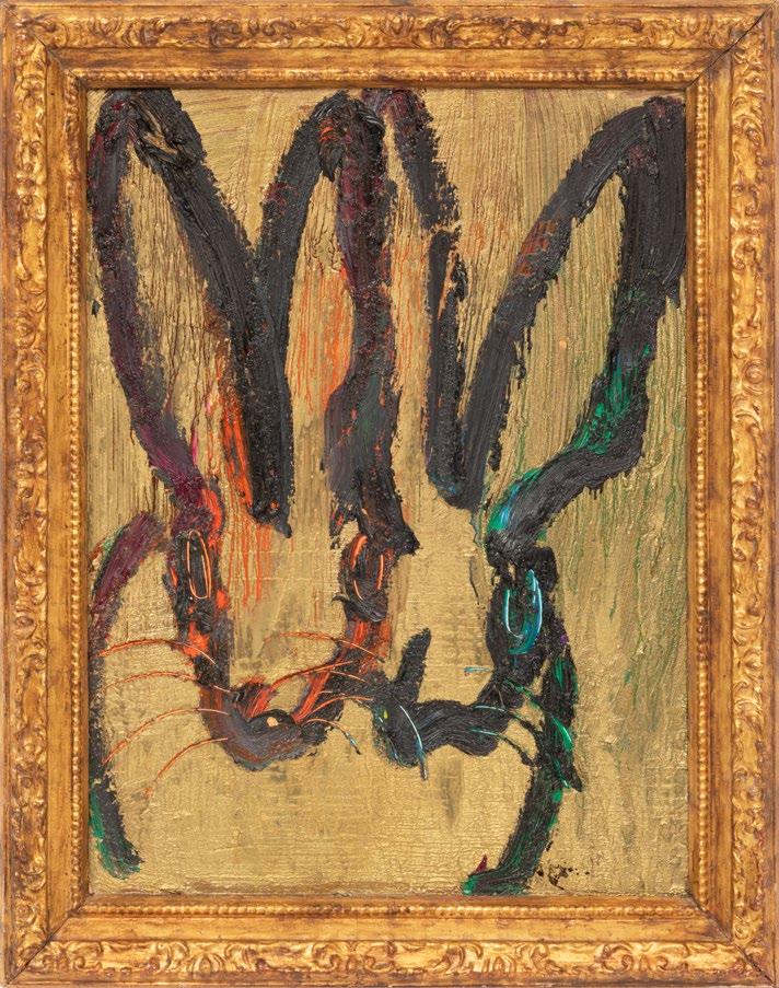 397. Hunt Slonem, American/Louisiana, b. 1951, “Untitled: Two Gold Bunnies”, oil on panel, 2015, signed, dated and inscribed “CRK01920” en verso, framed; accompanied by a copy of a certificate of authenticity from Hunt Slonem Studio. (2 pcs.) 15 3/4 x 12 in. (40 x 30.5 cm.), Frame: 19 x 15 x 1 in. (48.3 x 38.1 x 2.5 cm.)