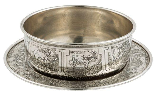 34. Wm. B. Kerr & Co. Sterling Silver Child’s Bowl and Underplate, late 19th/early 20th c., No. 5243, each with acid-etched panels of farm and domestic animals, bowl h. 1 3/4 in., dia. 4 1/4 in., plate dia. 5 5/8 in., weight 6.45 troy ozs. [$250 - 350]