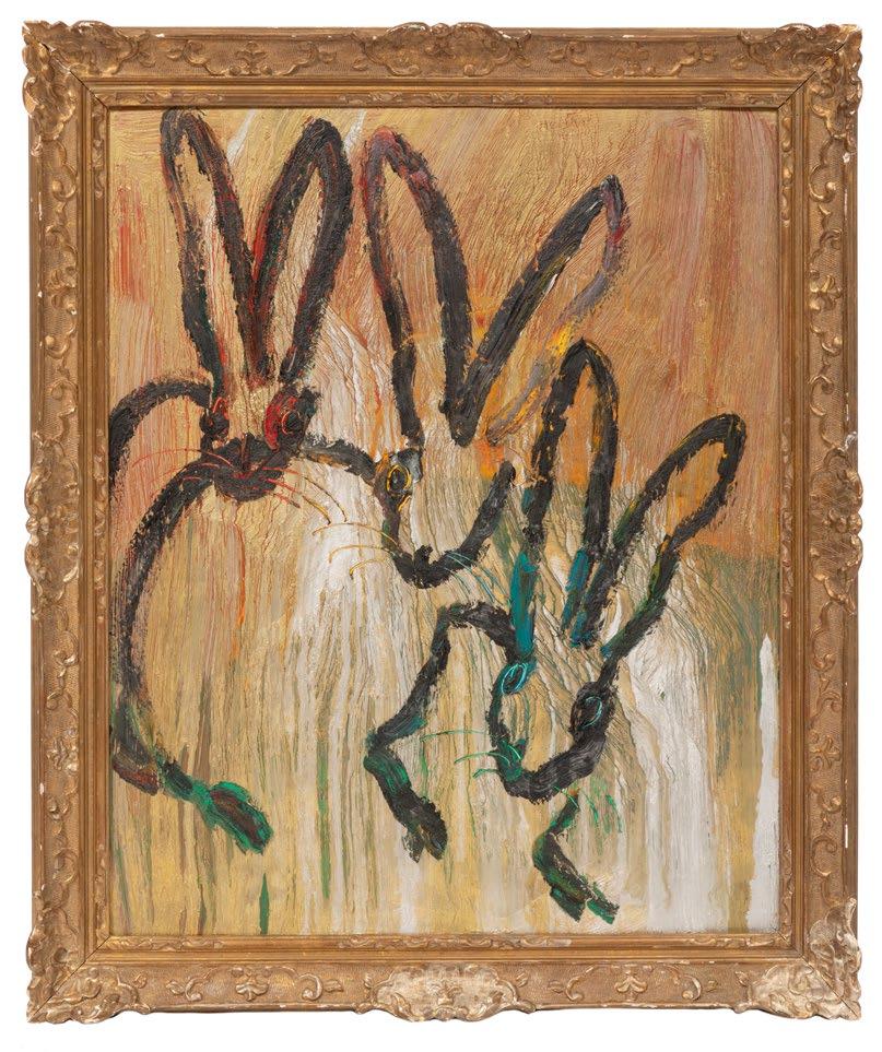 399. Hunt Slonem, American/Louisiana, b. 1951, “Untitled: Three Gold Bunnies”, oil on panel, 2015, signed, dated and inscribed “CRK00583” en verso, framed; accompanied by a copy of a certificate of authenticity from Hunt Slonem Studio. (2 pcs.), 33 3/4 x 27 1/2 in. (85.7 x 69.9 cm.), Frame: 39 1/2 x 33 x 2 in. (100.3 x 83.8 x 5.1 cm.) [$8,000 - 12,000]