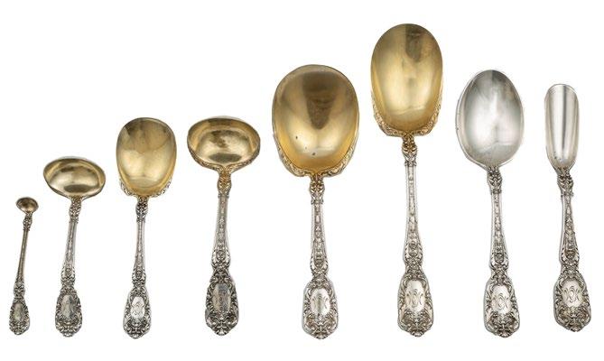 Sterling Silver Flatware Service, pat. 1939, designed by F. Russell Woodward and Axel H. Staf, incl. 22 forks (l. 7 5/8 in.), 24 knives (hh, l. 9 1/2 in.), 22 steak knives ( hh, l. 8 3/4 in.), 23 salad forks, 13 cream soup spoons, 20 teaspoons, 16 iced tea spoons, 20 cocktail forks, 17 butter knives (fh), 19 demitasse spoons, 7 tablespoons, 1 pierced tablespoon, salad serving spoon, 2 cold meat forks, gravy ladle, 2 cream ladles, large and small tomato servers, jelly server, sugar shell, 3 lemon forks, pickle fork, carving fork (hh) and 2 cake knives, most with Gothic “T” monogram; TOGETHER WITH Gorham “King Edward” tablespoon, Gorham “Strasbourg fork (l. 7 5/8 in.), Gorham “Melrose” fork (l. 7 3/4 in.), Gorham “Classic Bouquet” teaspoon, 11 Reed & Barton “Francis I” demitasse spoons, 3 Gorham “Baronial” demitasse spoons, Wallace “Carnation” olive spoon (l. 8 in.) and Dominick & Haff “Queen Anne” gravy ladle, total weight (weighable) 204 troy ozs.