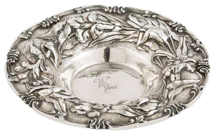 22. Antique American Sterling Silver Bowl, late 19th/early 20th c., wide molded border cast with calla lilies and irises with foliage on stippled ground, h. 1 1/2 in., dia. 7 1/8 in., weight 7.80 troy ozs. [$200 - 300]