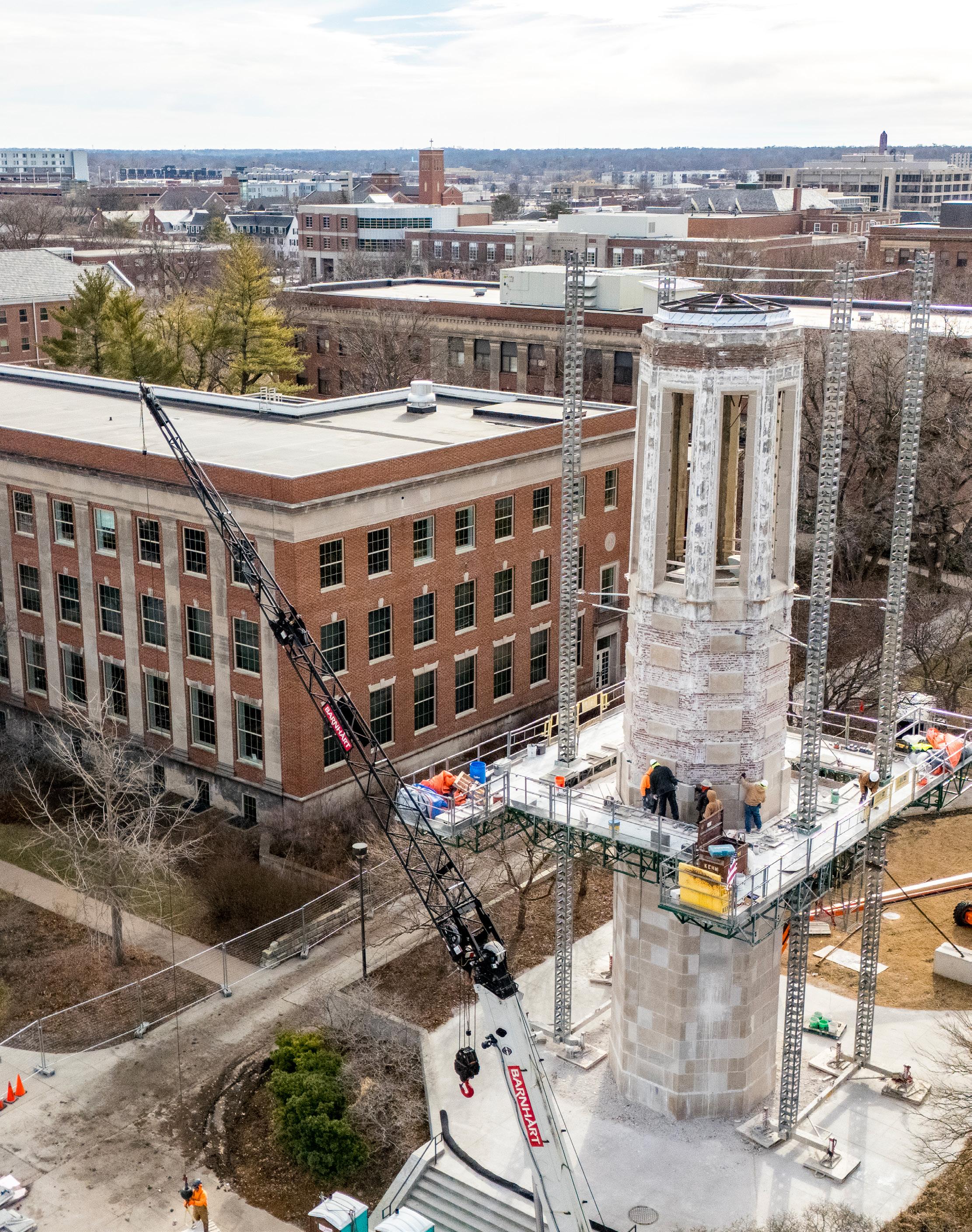 Restoration of the Mueller Tower on City Campus continues with crews reinstalling the limestone bricks on the outside.