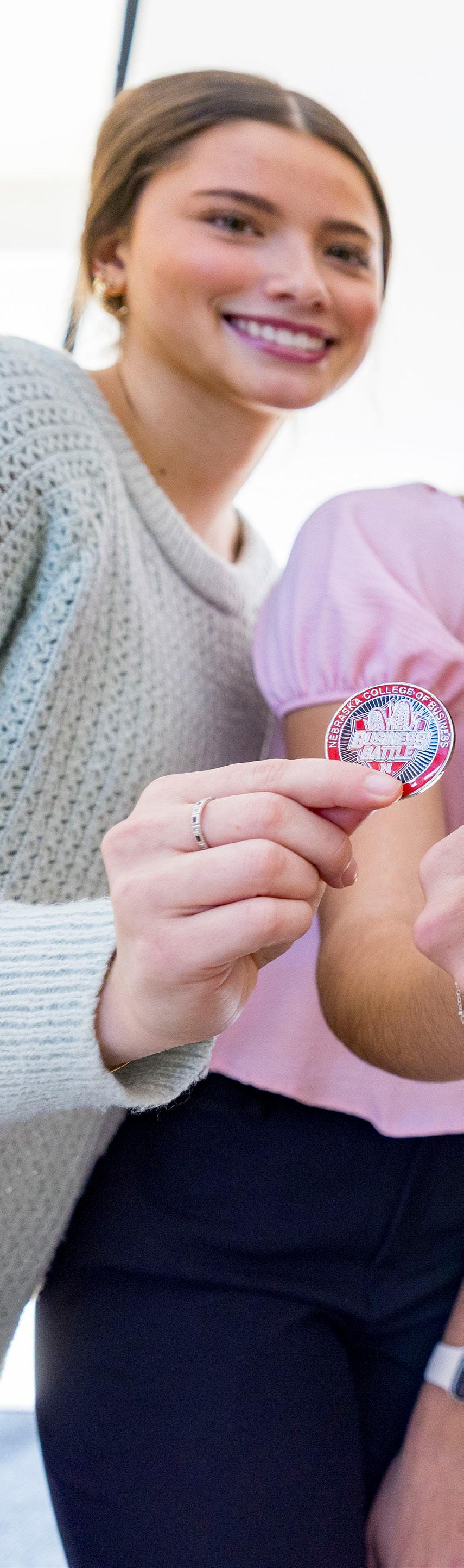 Students, from left, Jadyn Buckendahl, business administration major; Brooke Hicks, business and law major; Katie Murray, business and law major; Natalie Brand, actuarial science major and Kaia Cook, finance major. received a Business Battle challenge coin from MotoAmerica for completing the challenge.