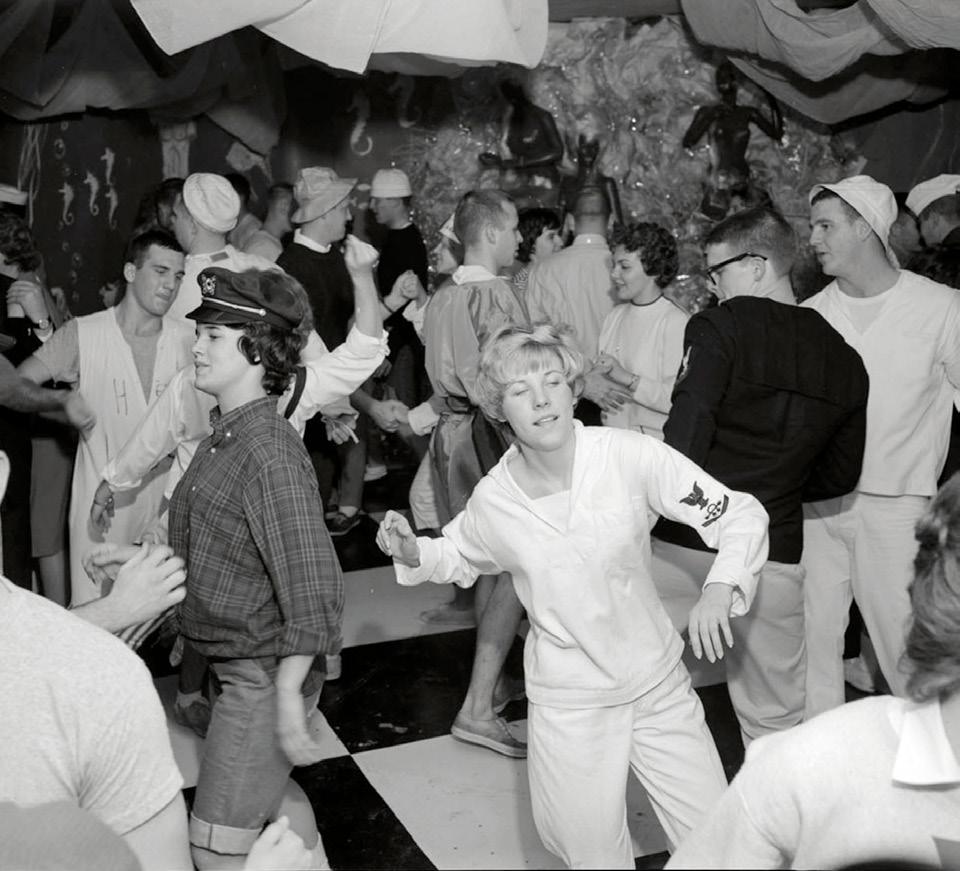 A handful of enthusiastic alumni identified the students dancing at the Phi Kappa Psi Shipwreck Party in 1961. In the white sailor outfit is the late Susan (Cole) Wright (’65), whose date Stephen North (’64) is behind her in the dark sweater and glasses. Phi Psi Allen Thomsen (’64) remembered the themed dance was in December 1961 and the fraternity would host a band to perform live music at the event. He noted that the ship “wasn’t the only thing that got wrecked.”