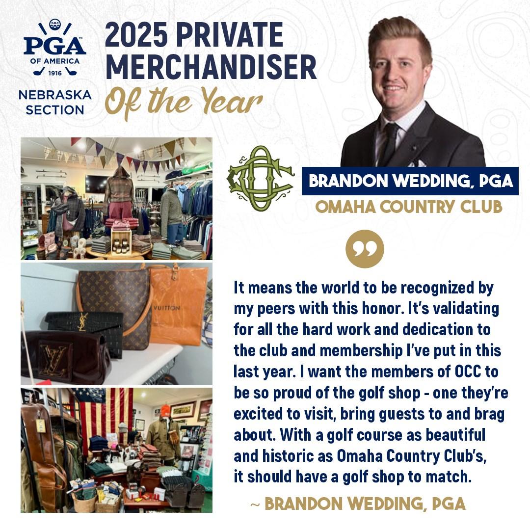 Service to the Nebraska Section PGA has also been a hallmark of Collins’ career. He has hosted and assisted with numerous Section, Nebraska Junior Golf, and Nebraska Golf Association events, including championships, qualifiers, junior tournaments, and high school competitions. His willingness to open his facility and share best practices has made him a trusted resource among his peers.