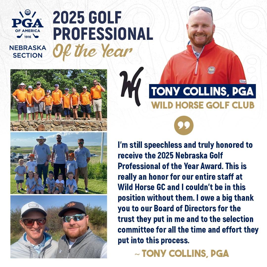 The Nebraska Section PGA is proud to announce that Tony Collins, PGA, Director of Golf at Wild Horse Golf Club in Gothenburg, has been selected as the 2025 Nebraska PGA Golf Professional of the Year.