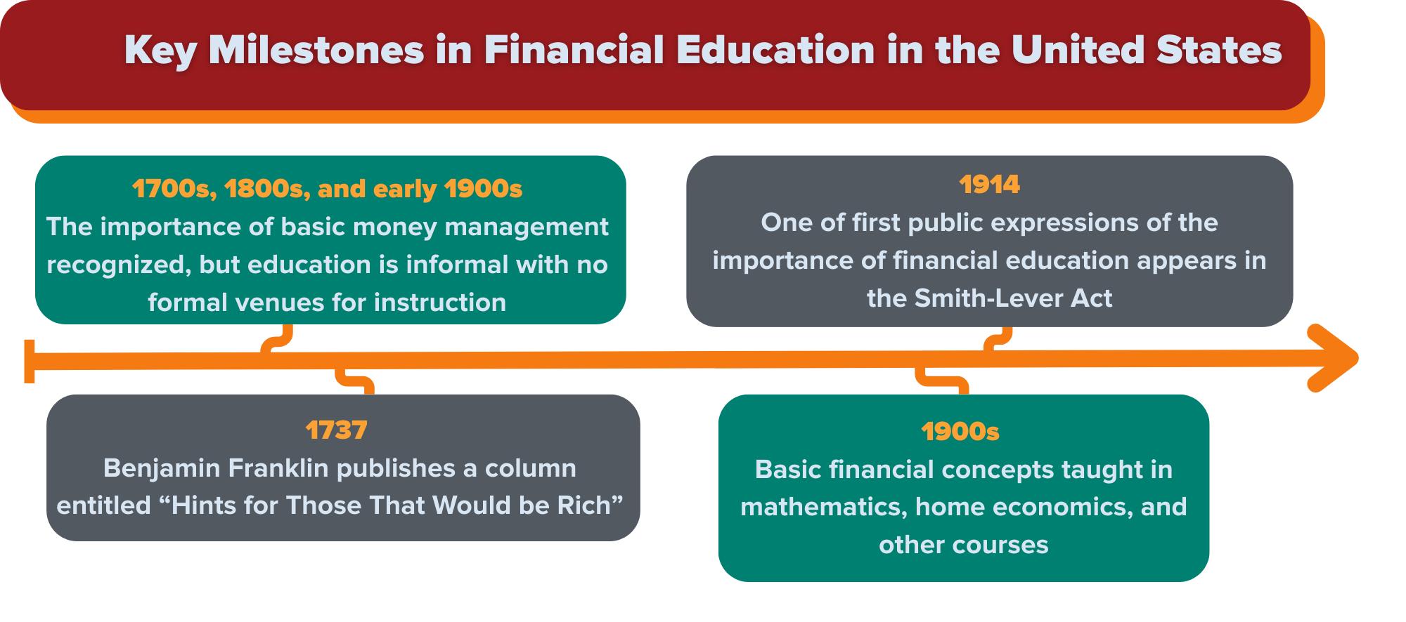 Long before financial literacy emerged as an educational topic in the early 20th century, people recognized the need to understand basic financial concepts to improve their decisionmaking and financial outcomes. Congress passed the Smith-Lever Act of 1914, established the Cooperative Extension Service, as one of the first public acknowledgments of the importance of financial education to individual well-being and society as a whole. In the early 20th century, some schools included financial education concepts in broader optional courses like mathematics and home economics. Even so, throughout much of the 20th century, families primarily taught financial education informally, passing down only basic concepts at home. It took decades before schools and institutions expanded beyond informal instruction. And while financial planners, banks, and other financial institutions expanded their offerings, access to financial knowledge often remained limited to those with significant resources or professional ties to the industry. In other words, people acknowledged the importance of financial education, but its implementation was inconsistent, with many institutions failing to treat it as a necessity for all.
