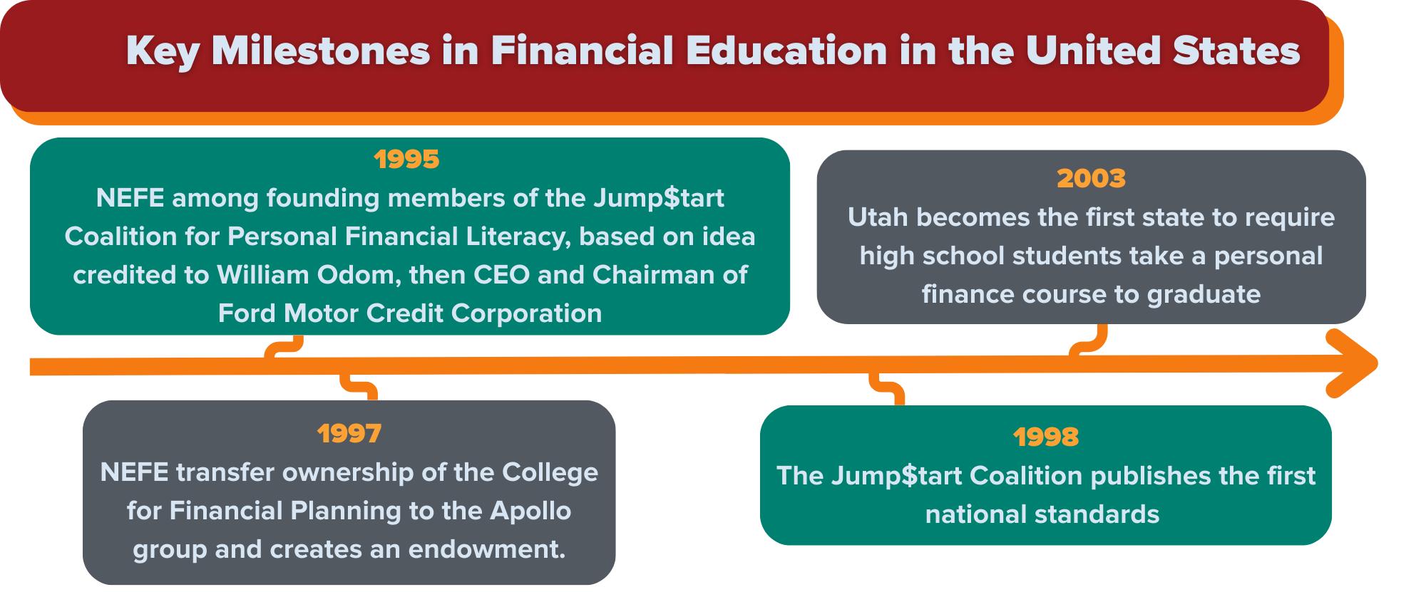 Financial education grew and continued to evolve in the late 20th and into the 21st century. Key milestones include NEFE launching its first financial education program in 1984, the Jump$tart Coalition being formed in 1995, and Jump$tart introducing the first national standards in 1998 (see below). These and other developments occurred as financial products and services (for example, credit and retirement accounts) became more widely available and more complex, and the demand for increased knowledge grew.