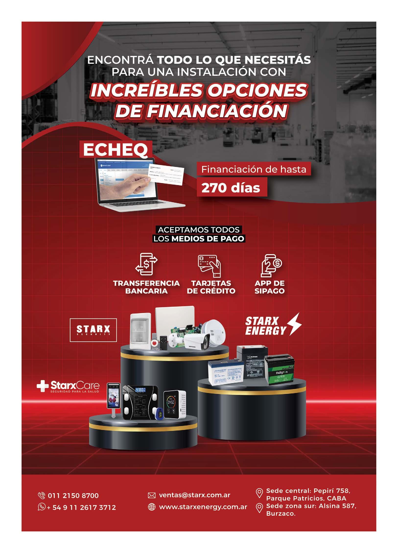 dándoles no solo stock de la más alta calidad internacional en productos de seguridad electrónica y de energía sino también manteniendo las mejores ofertas y beneficios, con opciones de financiación con Echeq en pesos de hasta 270 días. Además, quienes se acerquen a Starx encontrarán la posibilidad de abonar con una amplia variedad de medios de pago, contarán con la atención necesaria para analizar las alternativas más convenientes en cada caso particular, y obtendrán un servicio de posventa de excelencia.