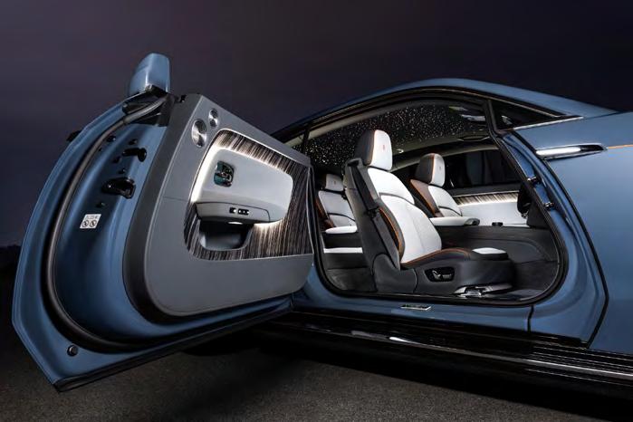 The Pantheon grille, the widest ever fitted to a Rolls-Royce, is illuminated by 22 LEDs that light up the sandblasted rear surface, creating a subtle threedimensional signature at night. The Spirit of Ecstasy figurine, redesigned for the Spectre, has a lower stance and more aerodynamic profile, contributing to the car’s drag coefficient of just 0.25 cd,