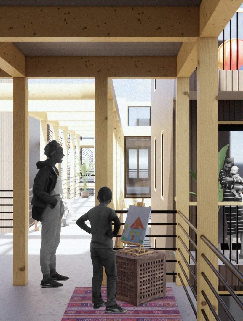 “The Space Between Us” amalgamates design inspirations from Peter Zumthor’s Home for Senior Citizens and Ryue Nishizawa’s Moriyama House. Taking a cue from Zumthor’s idea of a single-loaded corridor functioning as a shared living room, the project introduces communal spaces in the gaps between the project’s apartment blocks. These interstitial spaces, akin to the corridors in Zumthor’s design, become vibrant community zones that foster social interactions among residents who are free to furnish them however they like.
