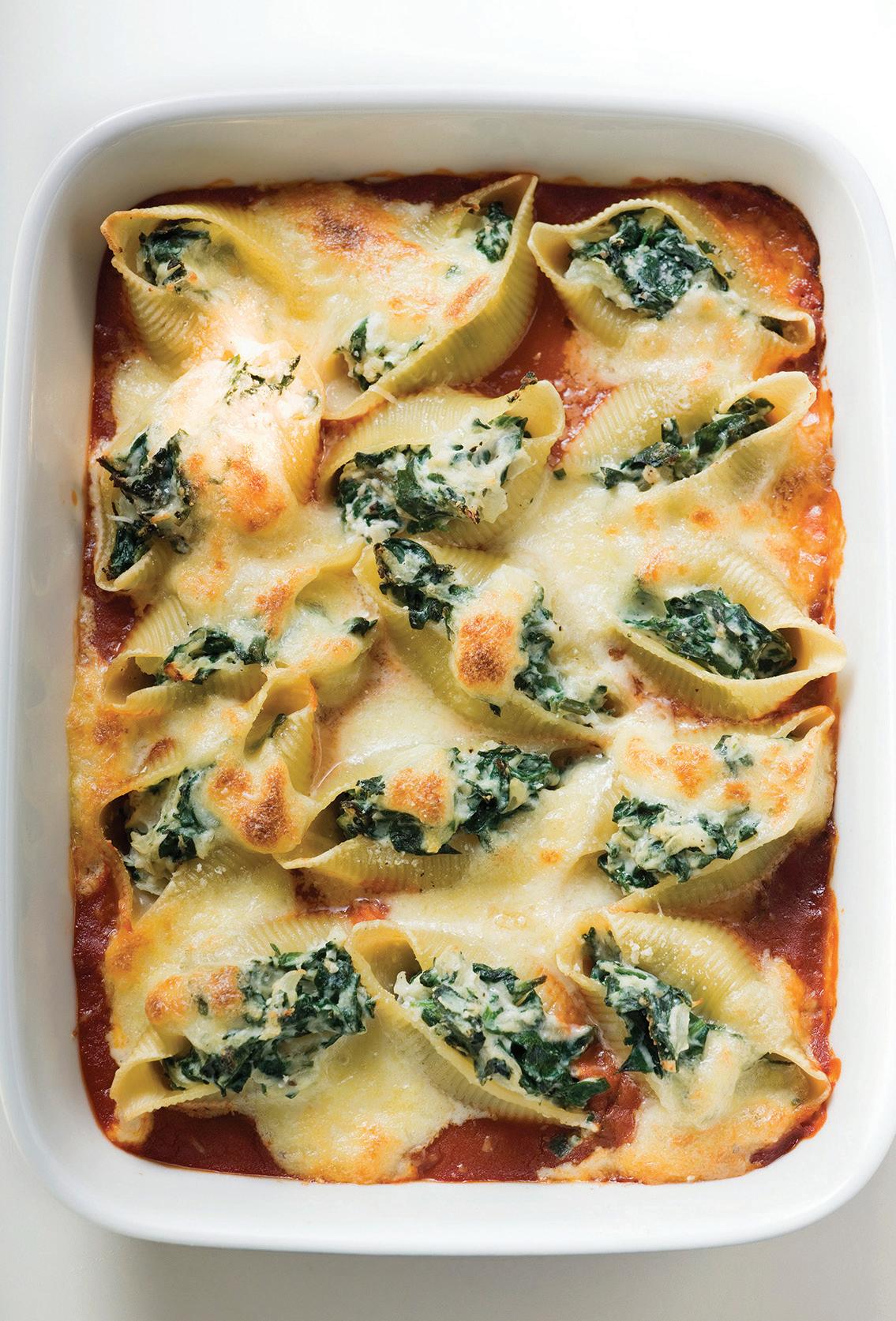 4. Spoon 1⁄2 cup marinara sauce evenly over bottom of 9- x 13- x 2-inch baking dish. Fill each pasta shell with spinach mixture. Place shells, filling side up, in prepared baking dish. Sprinkle with remaining 1⁄2 cup Parmesan. Cover loosely with foil and bake until heated through and bubbly, about 30 minutes. Spoon remaining sauce over shells.