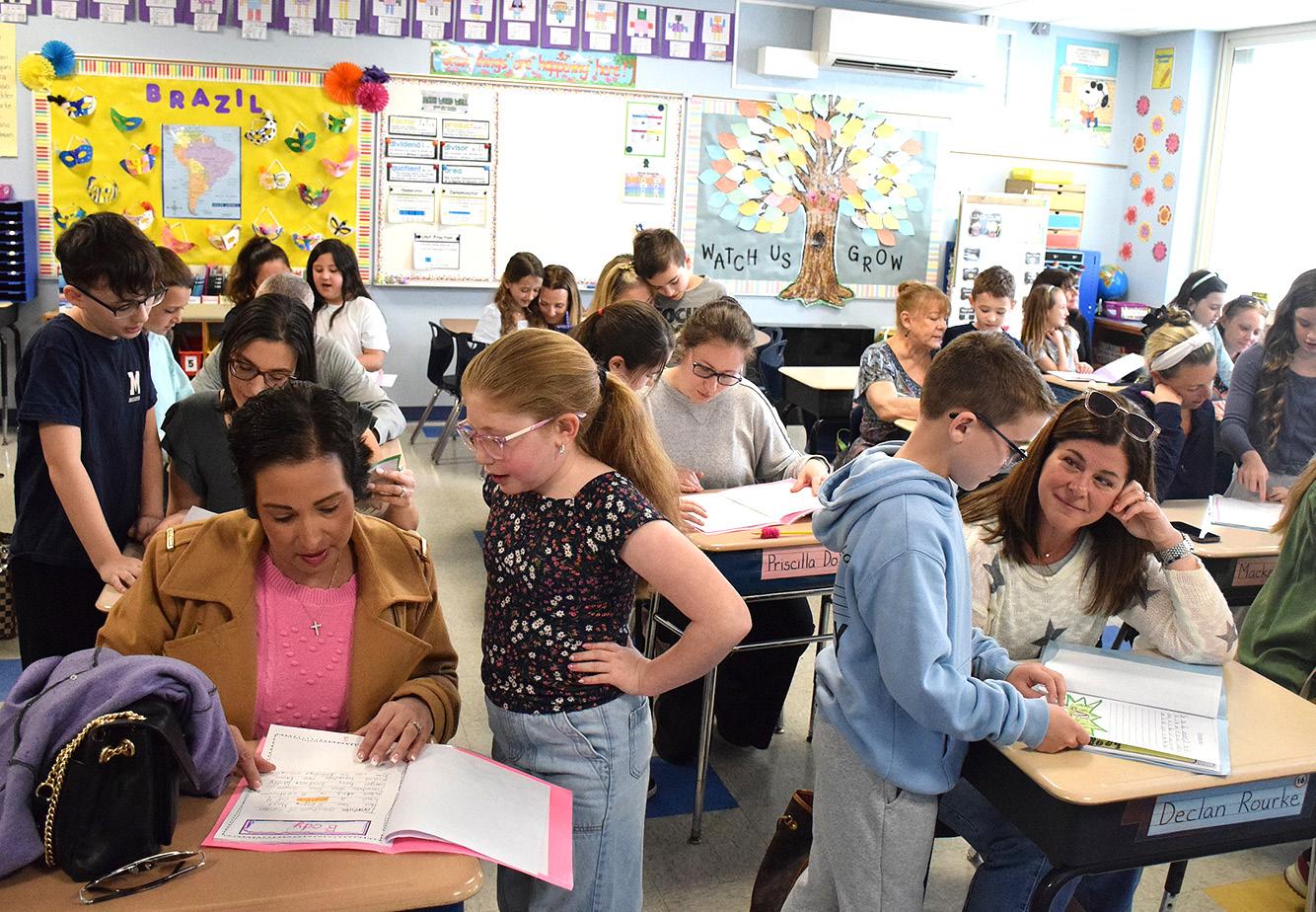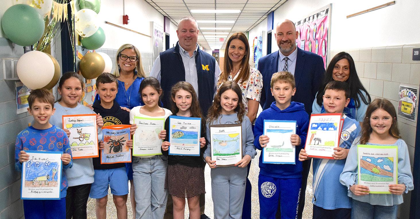 Lockhart Elementary School third graders held a writing celebration on April 1 for their Amazon Rainforest animal books. Joining several of the proud authors were, from left, teacher Colleen Kennedy, Superintendent Dr. William Brennan, teacher Connie-Jo O’Neill, Principal Michael DeLuca and teacher Therese Burch. Photos courtesy of the Massapequa School District