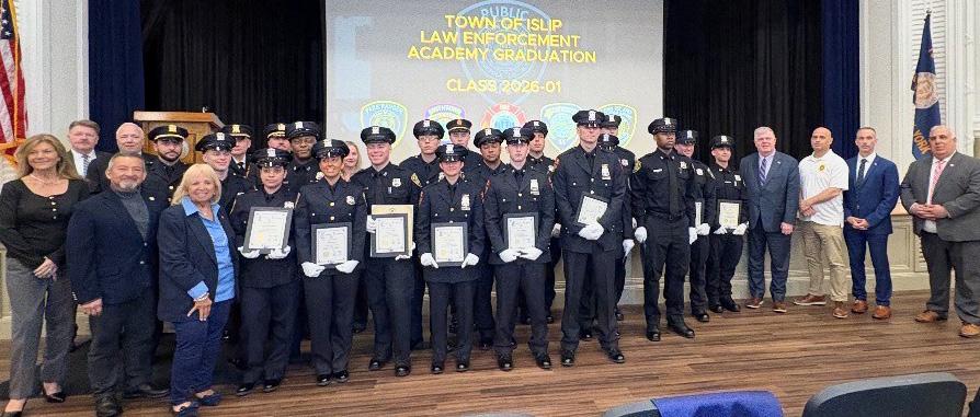 TOWN GRADUATES SPRING 2026 LAW ENFORCEMENT ACADEMY CADETS - The Town of Islip Law Enforcement Academy recently graduated its spring of 2026 class of cadets in the newly refurbished auditorium at 401 Main St., Town Hall West. The Town graduated cadets not just from the Town of Islip, but also the Towns of Smithtown and Babylon, bringing the total number of graduates to 128 since the program’s inception. Joining Supervisor Angie Carpenter to congratulate the recruits were Islip Town Councilman, Jorge Guadron, Supervisor Rich Schaffer of Babylon, Long Island MacArthur Airport and Town of Smithtown officials, among others.