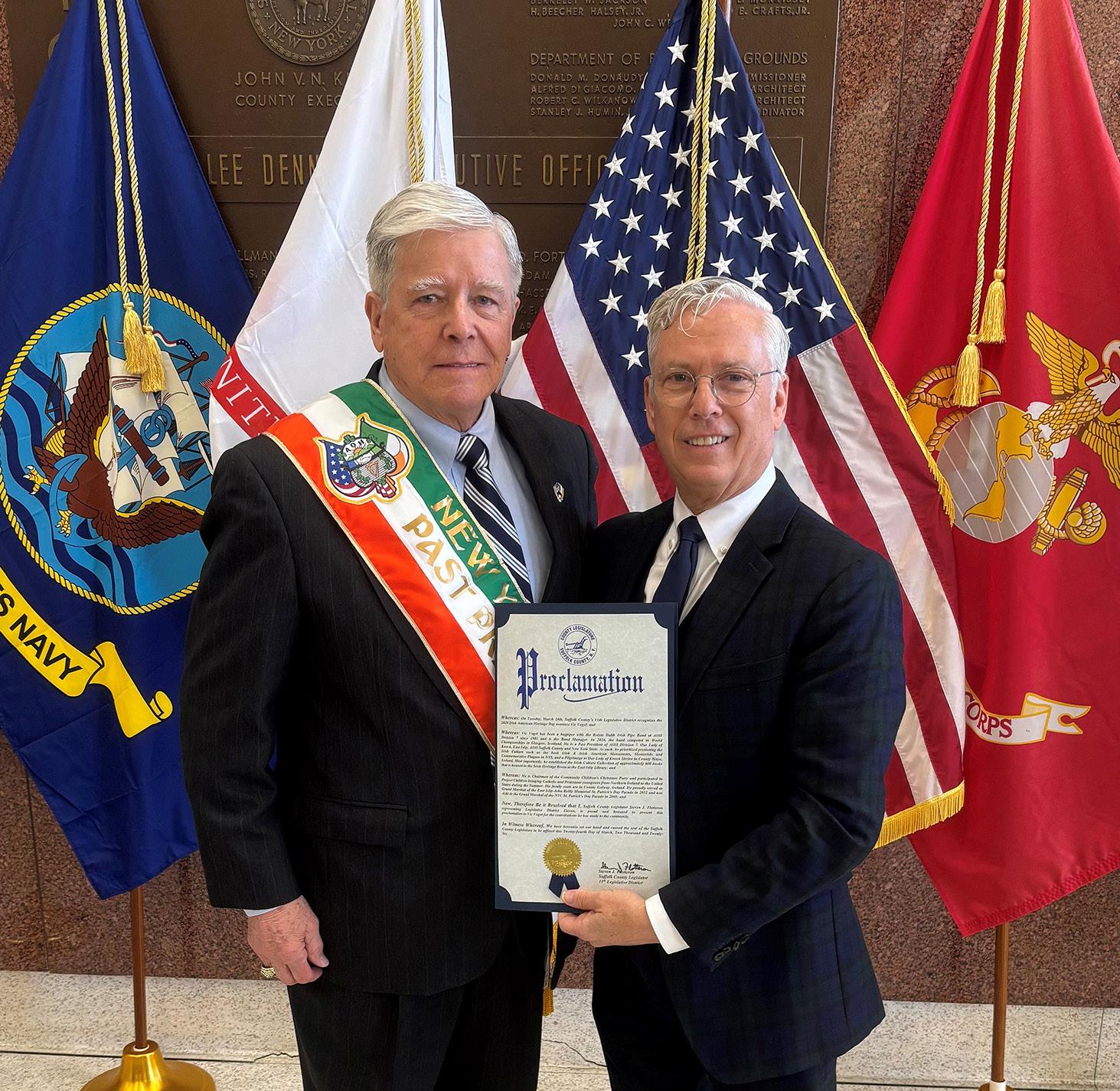 Legislator Steven J. Flotteron recognized Vic Vogel as the 11th Legislative District’s honoree at the 4th Annual Irish American Heritage Celebration held at the H. Lee Dennison Bldg. in Hauppauge.