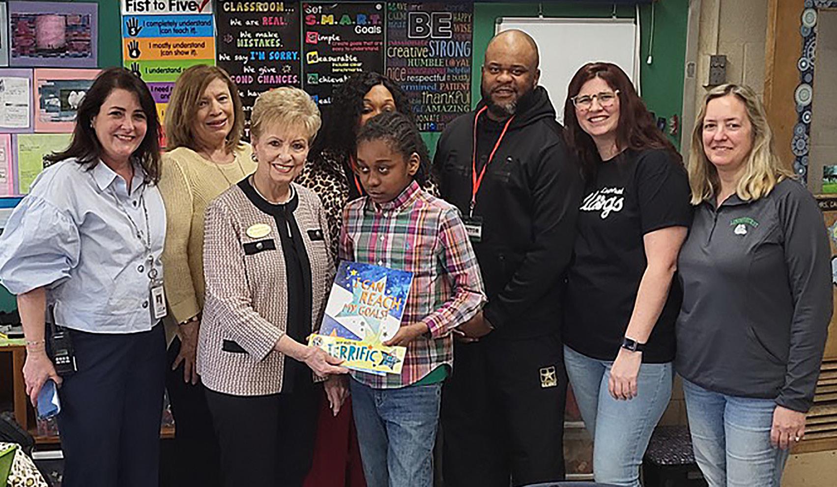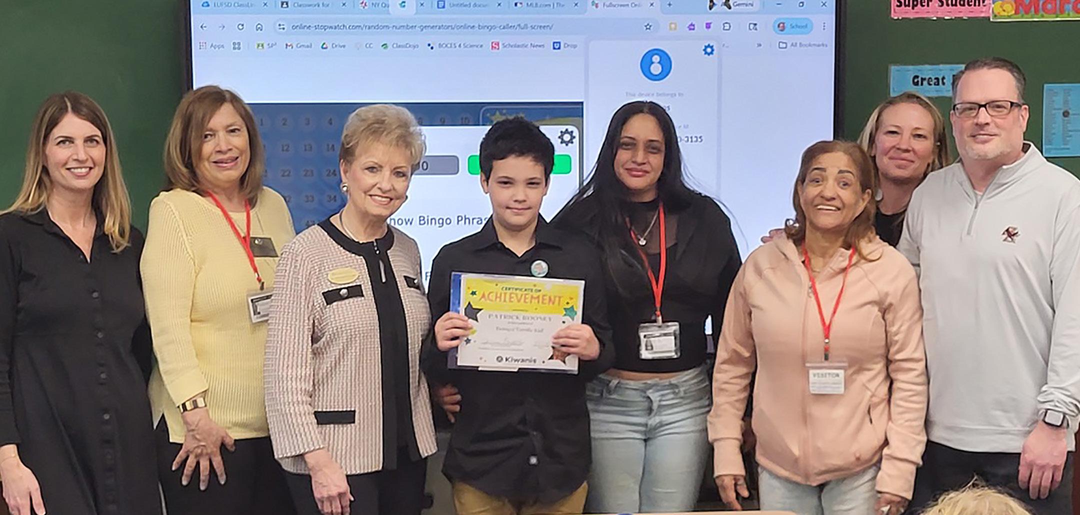 The Kiwanis Club of Lindenhurst recognized Daniel Street School student Prince Toussaint with its Terrific Kids award, a program established by Kiwanis International to promote character, self-esteem and perseverance. Prince was honored for his positive character and achievements. Pictured in the front row are Dr. Jennifer Deuidicibus, principal; JoAnn Boettcher, Kiwanis Club president; Prince Toussaint; Gardy Toussaint, father; and teachers Cynthia Morales and Victoria Cacioppo. In the back row are Paula Vidal, Kiwanis member, and Marie Sulma, mother.