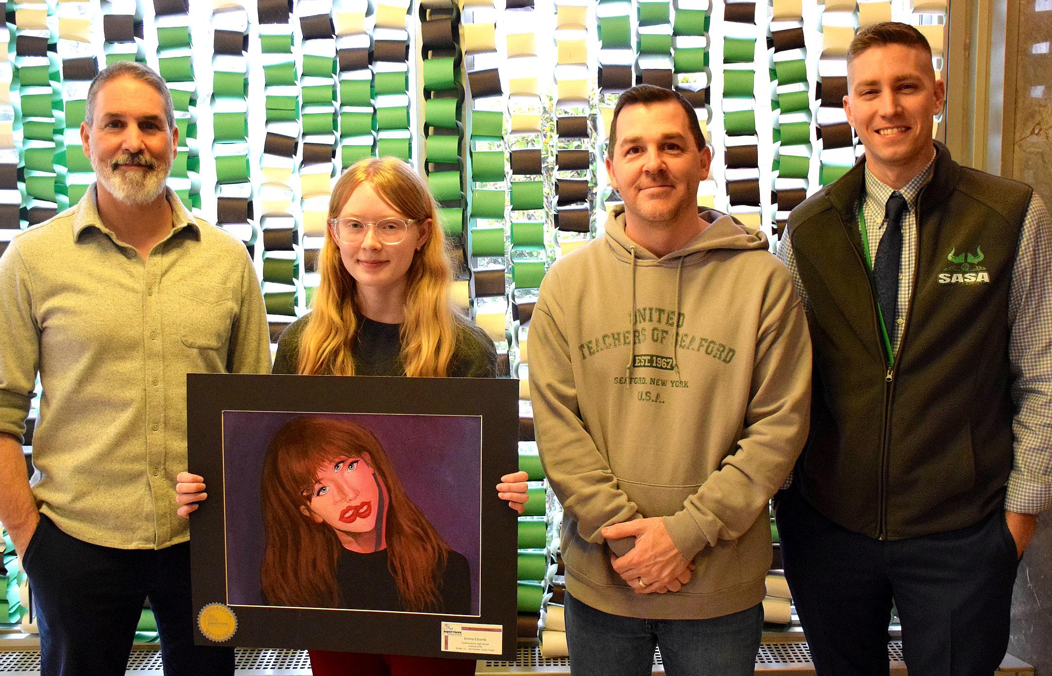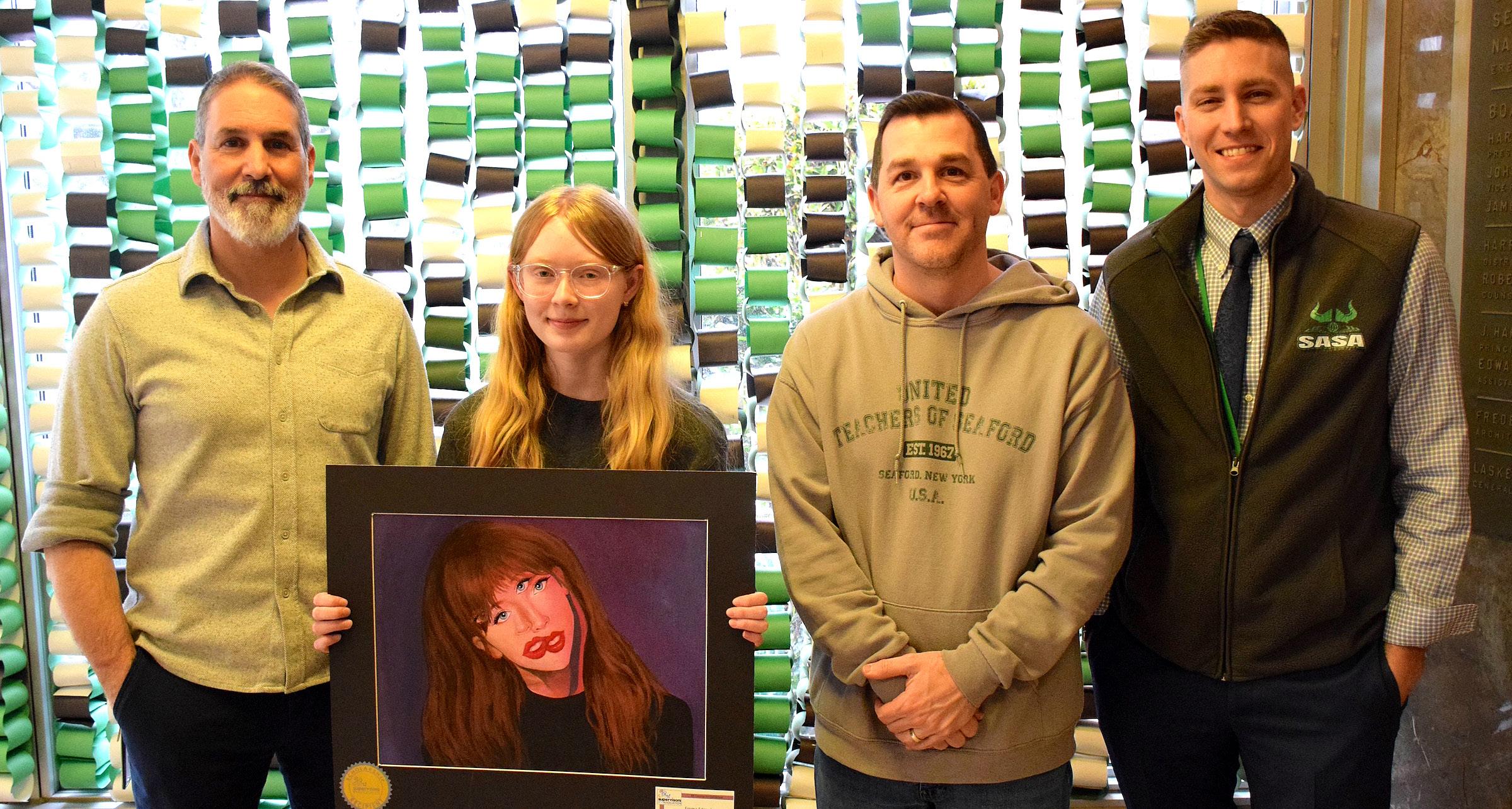 Seaford High School senior and All-County artist scholarship winner Emma Edzards was congratulated by art teachers Curtis Tripoli, left, and Michael Kerr, and Coordinator of Fine and Applied Arts Dr. Patrick Kennedy, right. Photo courtesy of the Seaford School District