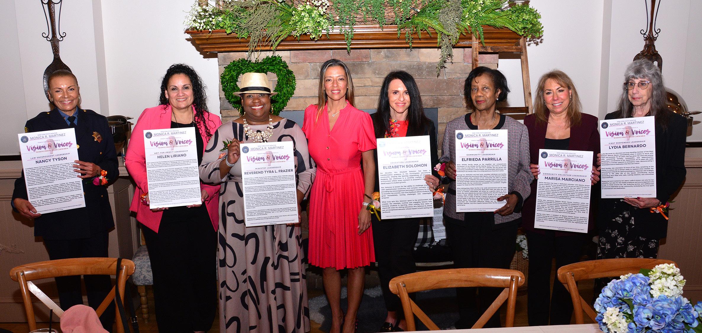 Photo (left to right): Nancy Tyson, Helen Liriano, Reverend Tyra L. Frazier, State Sen. Monica R. Martinez, Elizabeth Dolomon, Elfrieda Parrilla, Marisa Marciano and Lydia Bernardo during a ceremony honoring extraordinary female leaders from the Fourth Senatorial District.