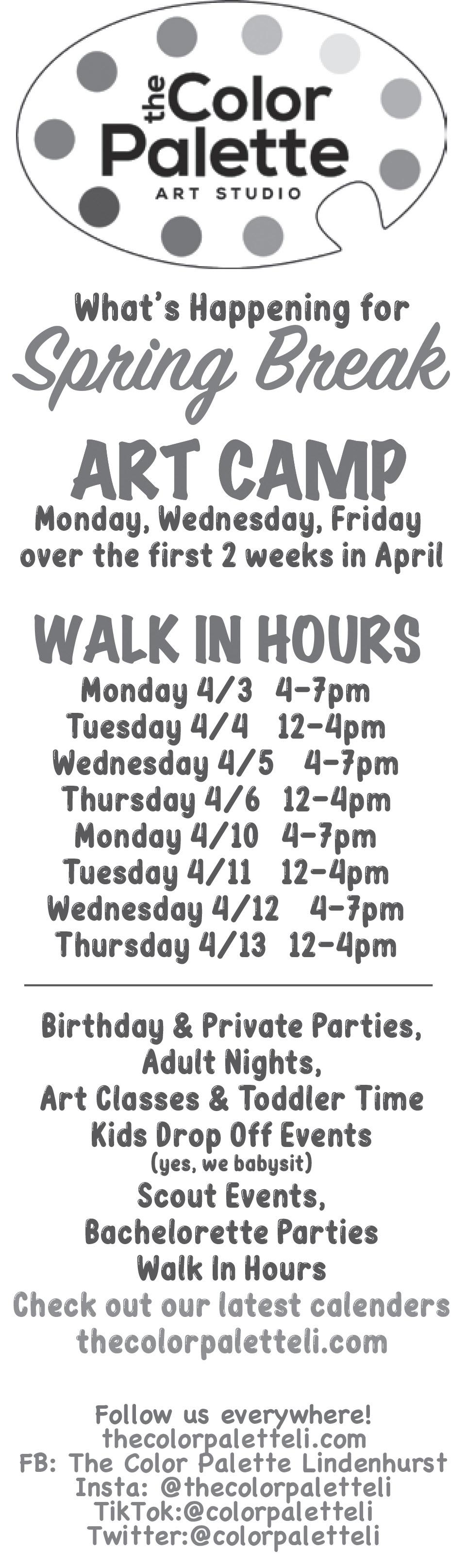 4 BABYLON SOUTH BAY’S NEIGHBOR NEWSPAPERS WEDNESDAY, APRIL 5, 2023 • WWW.LONGISLANDMEDIAGROUP.COM ONLY $2395 Pick Up Or Free Delivery + Tax With Coupon Only. Must Mention Coupon When Ordering. Cannot be Combined. Expires 4/12/23 Plus 2 Liter Soda OVER STUFFED HOT HEROES Choose Any 2: Potato & Eggs Hero Meatball Parm Hero Sausage Parm Hero Chicken Parm Hero Sausage & Peppers Hero Eggplant Parm Hero e Original - Brick Oven of Lindenhurst FREE DELIVERY $15 MINIMUM 51A West Hoffman Ave. (Corner South 2nd Street) (631) 225-4444 TRY OUR 2ND SPICESTREET PIZZA! 410023N040523 Since 1959 ONLY $1795 + Tax With Coupon Only. Must Mention Coupon When Ordering. Cannot be Combined. Expires 4/12/23 WOW SUPER SPECIAL 18” XTRA LARGE PIE Pick Up Only COMPLETE FAMILY TABLE Choose Any 2 Dinners Served With 12 Garlic Knots, 2 House Salads, 2 Desserts (Chocolate Pudding Or Rice Pudding) Choices: Baked Ziti Penne Ala Vodka Baked Lasagna Baked Ravioli Penne Carbonara Spaghetti & Meatballs ONLY $2995 Pick Up Or Free Delivery + Tax With Coupon Only. Must Mention Coupon When Ordering. Cannot be Combined. Expires 4/12/23 Family That Eats Together Stays Together BACK BY POPULAR DEMAND LIMITED TIME FOR LENT SPASSO’S FAMOUS BAKED CLAM PIZZA 2 TEN INCH PERSONAL BAKED CLAM PIZZAS 2 LITER SODA $2999 +TAX With Coupon Only. Must Mention Coupon When Ordering. Cannot be Combined. Expires 4/12/23 2 Jumbo Shrimp Parmigiana Heroes On Garlic Bread 2 Liter Soda Tray of Jumbo Shrimp Parmigiana (Feeds4-5 People) 12 Garlic Knots 2 Liter Soda 18” Extra Large Pizza Loaded With Mixed Garden Fresh Vegetables & Smothered In Extra Cheese +6 Garlic Knots + 2 Liter Soda ONLY ONLY ONLY $2895 $2795 $3695 Pick Up Or Free Delivery + Tax + Tax + Tax With Coupon Only. Must Mention Coupon When Ordering. Cannot be Combined. Expires 4/12/23 With Coupon Only. Must Mention Coupon When Ordering. Cannot be Combined. Expires 4/12/23 With Coupon Only. Must Mention Coupon When Ordering. Cannot be Combined. Expires 4/12/23 VEGETABLE PIZZA LENTEN HERO SPECIAL LENTEN PLATTER Spasso’s Garden Fresh IT’S BACK FOR LENT! Limited Time Only! Reliable, Honest & Quality, Professional Service That You Can Trust. Benefits of Air Duct Cleaning • Reduce Health Risks • Cleaner Air • Reduce Odors • Energy Cost Savings • Extended Furnace Life • Prevent Fires ECOPROVENT INC. 516-862-8265 Free phone estimate. Licensed and Insured. Residential & Commercial Schedule Your Cleaning Today! 10% SENIOR DISCOUNT 409523N040523 DRYER DUCT CLEANING SPECIAL We Power brush and HEPA vacuum the entire length of every duct line per single zone system. Cannot be combined with other offers. Coupon must be present at a time of sale. Expires 5/3/23 AIR DUCT CLEANING & DISINFECTING UNLIMITED VENTS/RETURNS Cannot be combined with other offers. Coupon must be present at a time of sale. Expires 5/3/23 SPRING SPECIAL $ 269 only $ 119 THIS WEEK ONLY FREE Dryer Vent Cleaning With Any Air Duct Cleaning Expires 4/12/23 CLEAN THE AIR YOU BREATHE OVER 40 YEARS EXPERIENCE NEAT, RESPONSIBLE & AFFORDABLE PAINTING INTERIOR / EXTERIOR Aluminum Siding Re nishing Water Damage / Mold Removal Sheet Rock / Taping / Spackle Carpentry / Skim Coating DAVE’S PAINTING Office: 516.334.3207 • Cell: 516.860.8041 Closet Painting With 3 Or More Rooms See Our Website For Portfolio & Testimonials Licensed Insured www.DavesPaintingNY.com FREE FREE QUOTES 409526N040523