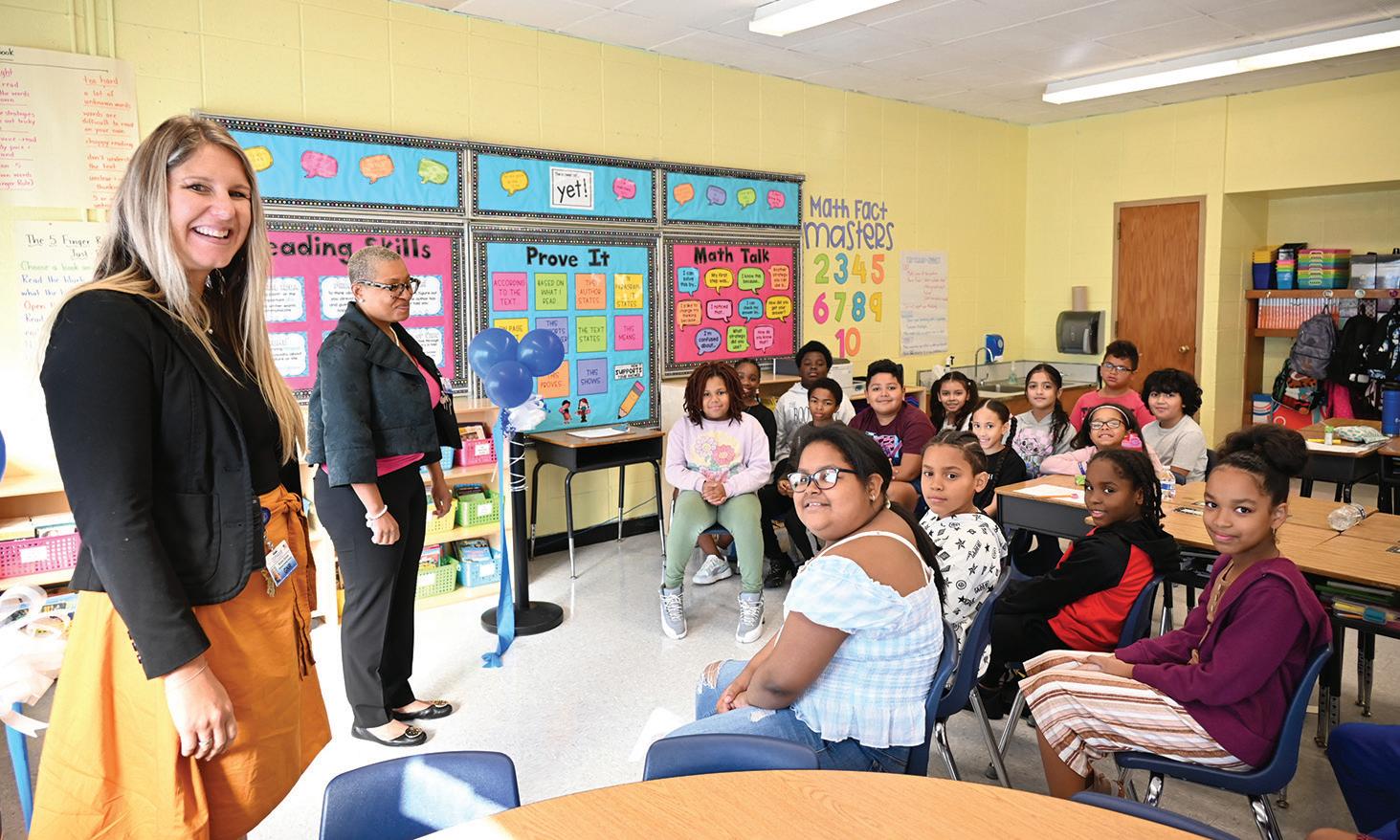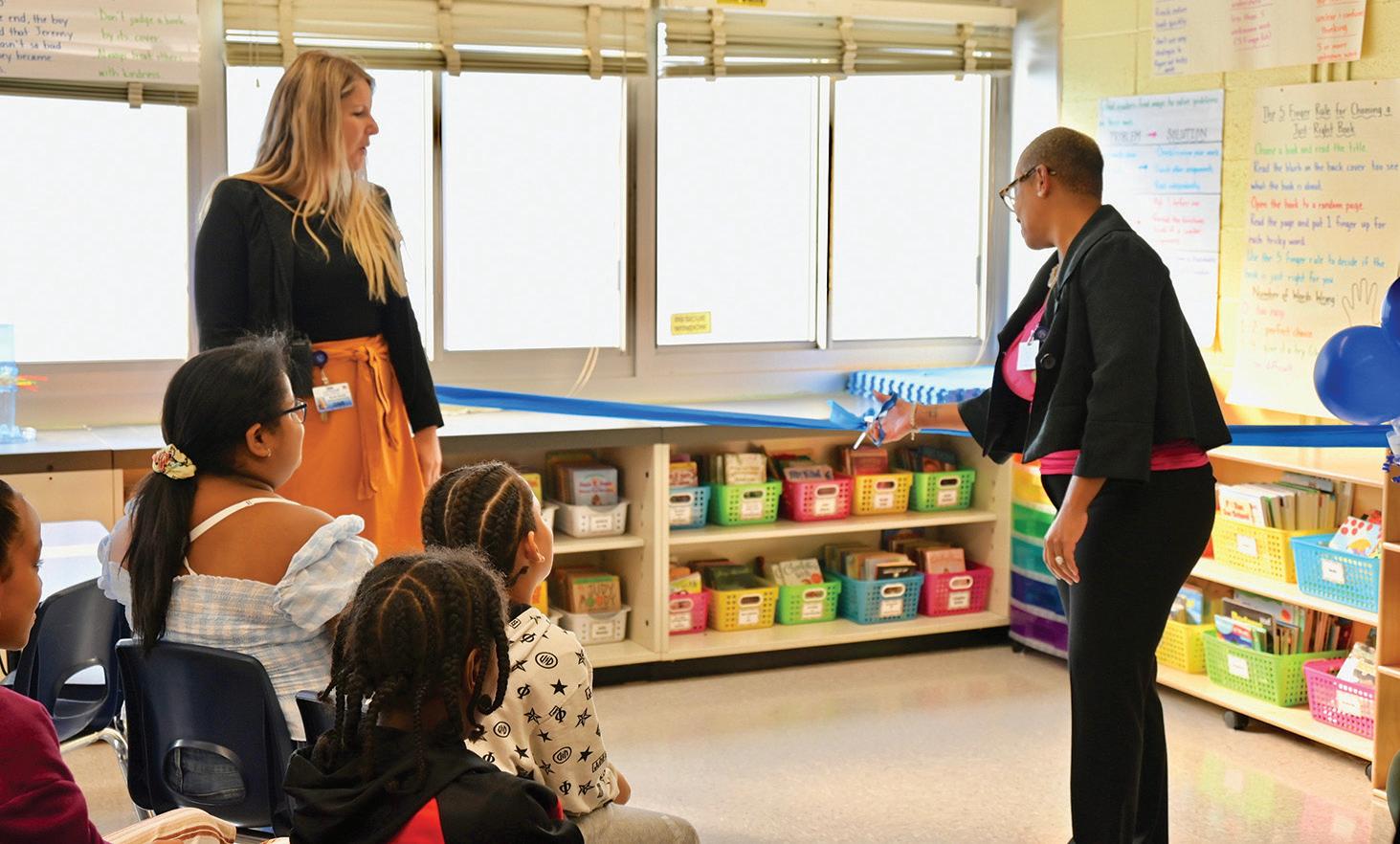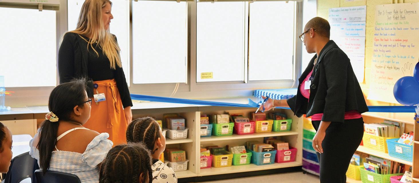 GREAT NECK ROAD CUTS THE RIBBON ON NEW CLASSROOM LIBRARIES - Great Neck Road Elementary School in the Copiague School District recently concluded its educational pep rally. As part of the culminating activity, a ribbon-cutting ceremony was held in each classroom to officially open each new classroom library. Great Neck Road staff and students all celebrated the new books that were added to their classroom libraries this year. Pictured are Great Neck Road Principal Tamika Eason and Great Neck Road assistant principal Nicole Dunne cutting the ribbon in Ms. Staiano’s fourth grade class. Great Neck Road students are excited to dive into new books this school year. Photos courtesy of Copiague School District