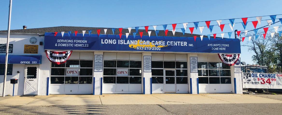 16 DEER PARK SOUTH BAY’S NEIGHBOR NEWSPAPERSWEDNESDAY, OCTOBER 11, 2023 • WWW.LONGISLANDMEDIAGROUP.COM LONG ISLAND CAR CARE CENTER INC. 333 BAY SHORE ROAD • DEER PARK • 631.213.2300 HOURS: MONDAY - FRIDAY 8AM-6PM • SATURDAY 8AM-1PM Quick Lube Checklist COMPLETE OIL & FILTER CHANGE CHASSIS LUBRICATION CHECK TRANSMISSION FLUID CHECK DIFFERENTIAL FLUID CHECK BRAKE FLUID CHECK POWER STEERING FLUID FILL WINDSHIELD WASHER FLUID CHECK AIR FILTER CHECK WIPER BLADES CHECK TIRE PRESSURE LUBRICATE DOOR HINGES CHECK PCV VALVE CHECK LIGHTS CHECK BATTERY TERMINAL CHECK ANTIFREEZE COOLANT CHECK BREATHER ELEMENT TECHNICIAN National Institute For AUTOMOTIVE SERVICE EXCELLENCE 412469N101123 HAVE A LARGE COMMERCIAL OR RECREATIONAL VEHICLE? MONTHLY PARKING SPACES AVAILABLE FOR RENT $5 OFF $10 OFF $3499 $14999 SYNTHETIC OIL CHANGE ANY SERVICE OVER $100 REGULAR OIL CHANGE FRONT OR REAR BRAKE PADS Up To 5 Quarts. Cartridge Oil Filters Extra. Reg. $79.99 +TAX +TAX +TAX PER SET Up To 5 Quarts. Cartridge Oil Filters Extra. Electronic Brake Systems Extra Cannot be combined with any other offer. Cannot be combined with any other offer. $4500 FREE PRE-PURCHASE INSPECTION +TAX Let Us Inspect The Vehicle Before You Buy It! With Any Repairs Of $350 Or More Cannot be combined with any other offer. $29999 BRAKES & ROTORS INSTALLED +TAX PER SET Starting At Coated Rotors / Electronic Brake Systems Extra Cannot be combined with any other offer. $7500 FREE SCAN FRONT WHEEL ALIGNMENT REGULAR OIL CHANGE CHECK ENGINE LIGHT ON?? +TAX Starting At Minivans & SUV's Extra Cannot be combined with any other offer. Cannot be combined with any other offer. Cannot be combined with any other offer. Cannot be combined with any other offer. Cannot be combined with any other offer. NEW YORK STATE INSPECTIONS DONE HERE Se Habla Español $8500 +TAX Radiator Drain/Flush/Fill Green Coolant Up to 2 Gallons. Dex-cool/Euro Coolant Extra ANTI-FREEZE SPECIAL Cannot be combined with any other offer. DISTRIBUTOR INCLUDING EUROPEAN TYPES