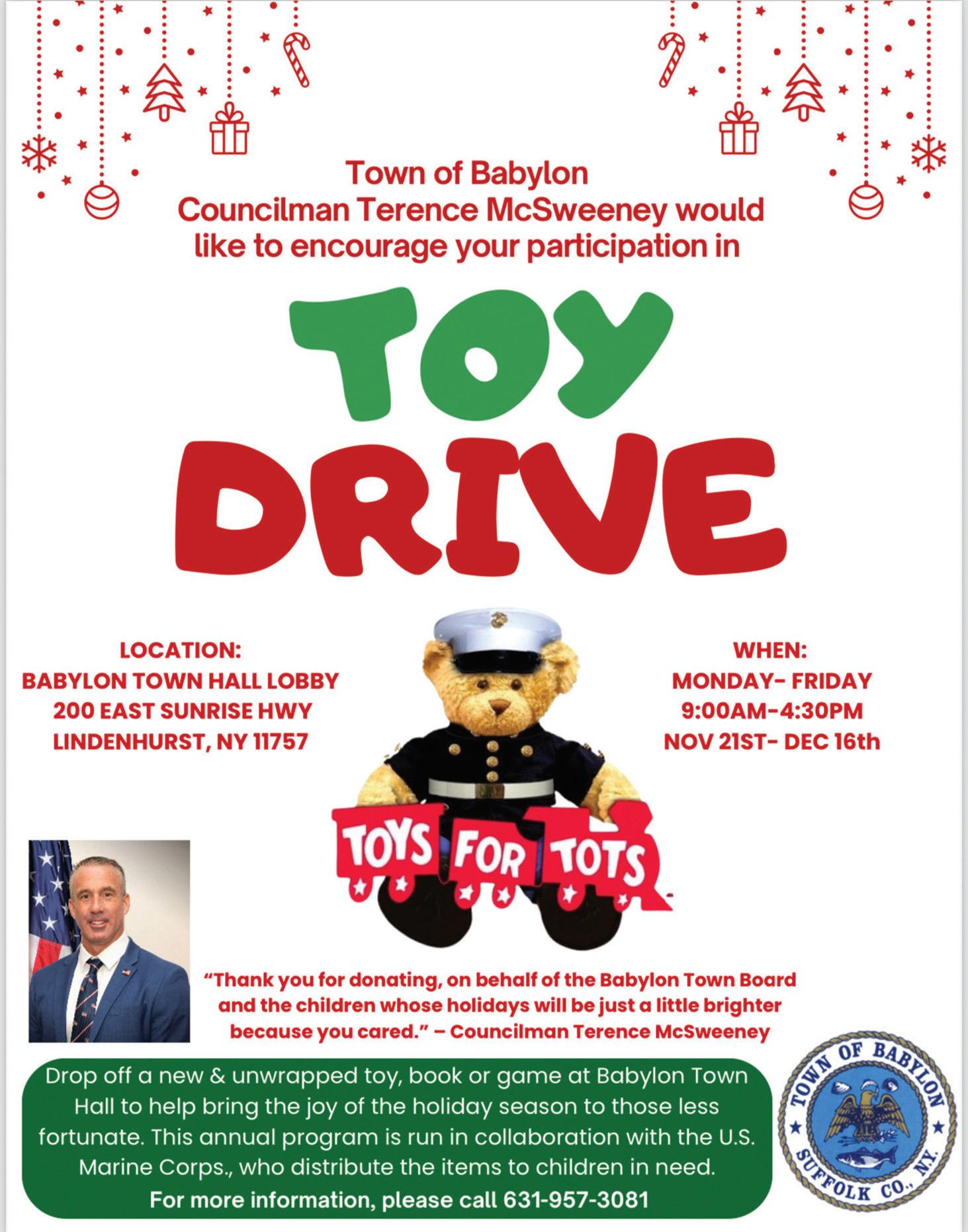 Town of Babylon Councilman Terence McSweeney would like to encourage your participation in his Toy Drive. Please Drop off a new & unwrapped toy, book or game at Babylon Town Hall Lobby, 200 East Sunrise Hwy. in Lindenhurst. This annul event is in collaboration with the U.S. Marine Corps., who distribute the items to children in need. For more information, please call 631-957-3081