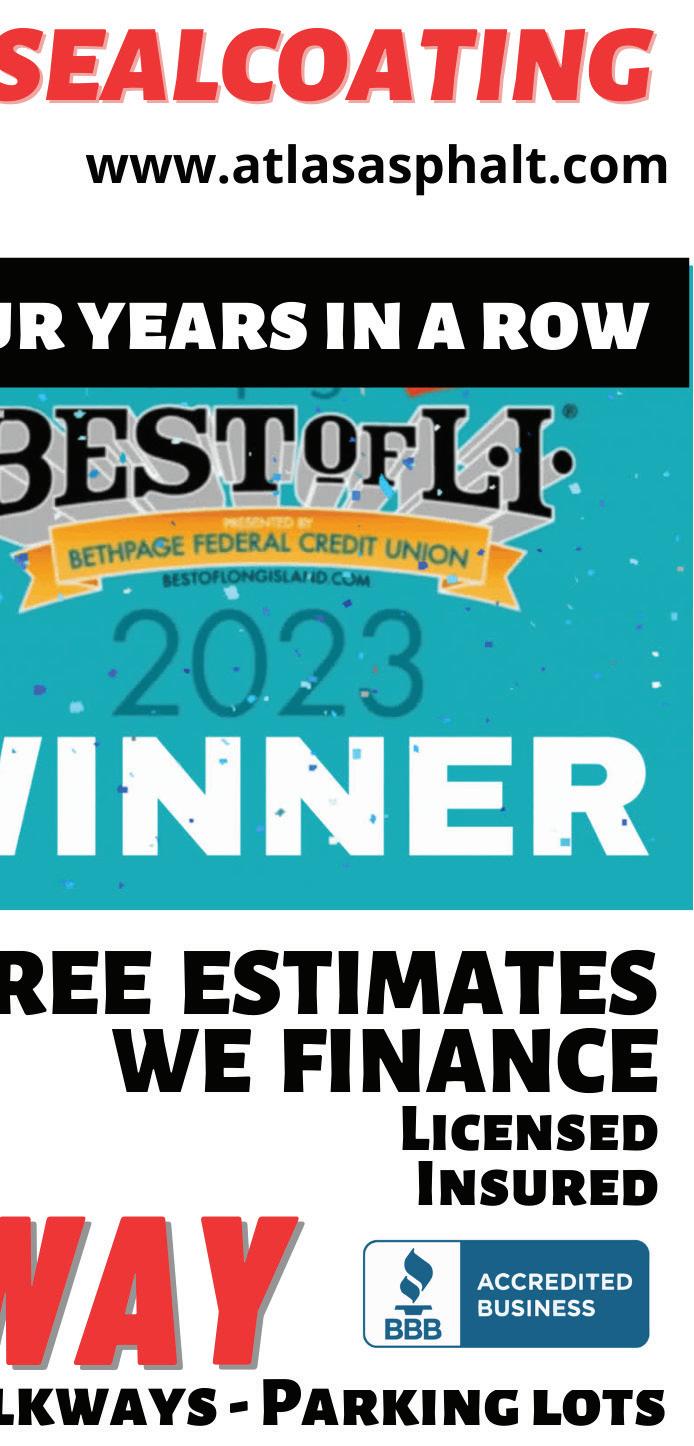 11 EAST ISLIP SOUTH BAY’S NEIGHBOR NEWSPAPERSWEDNESDAY, MARCH 22, 2023 • WWW.LONGISLANDMEDIAGROUP.COM ROOFING STORM SPECIALISTS FREE ESTIMATES COMMERCIAL & RESIDENTIAL • ROOFS • SHINGLES • FLAT ROOFS • REPAIR SPECIALISTS LEADERS & GUTTERS • GAF CERTIFIED INSTALLERS 10% MILITARY DISCOUNT/ SENIOR DISCOUNT (MUST SHOW ID) AVAILABLE TO WORK IN ALL TYPES OF WEATHER Above All ROOFING Better Business Bureau Member CALL TODAY! Lic./Ins. #16739H.I. #HI8B43900000 WWW.ABOVEALLROOFINGLI.COM 631-665-3158 Ask About Our Extended Manufacturer’s Warranty. 380228N032223 LANDSCAPING APPLE LANDSCAPING (631) 786-5481 applelandscaping@ymail.com Lic. / Ins. Weekly Maintenance Spring Cleanups Fertilize • Organics Aerating • SOD/Seed SPRING SPECIALS! 409649N032223 OIL DELIVERIES / BURNER SERVICE 363884N032223 3/31/23 CHIMNEY SERVICE DONE BY FIREFIGHTERS THAT CARE SINCE 1982 STAINLESS STEEL LINERS CLEANING & REPAIR SPECIALISTS CHIMNEYS REPAIRED, REBUILT & TUCKPOINTING FULLY LICENSED & INSURED WWW.CHIMNEYKINGINC.COM CHIMNEY KING ENT, INC. NYC License # 2061397-DCA • Nassau County License # H0708010000 Suffolk County License # 41048-H 516-766-1666 • 631-225-2600 409651N032223 FREE ESTIMATES MASONRY SPECIALIST TREE SERVICE DANK, INC Tree Experts FREE ESTIMATES 516-799-1331 631-254-0059 • Tree Removal • Stump Grinding • Pruning • Land Clearing Policeman, Fireman, Senior Discounts CODE: SB495 409332N032223 OWNER OPERATED Nassau License # H2081200000 Suffolk License # 45806-H Nassau Office Suffolk Office 10% OFF Any Job Over $500 Must Present Coupon At Time Of Estimate. We’ll Meet & Beat Any Price! FUEL OIL GENESIS FUEL OIL 631-249-1438 www.genesisfueloil.com • HEAP ACCEPTED • SAME DAY DELIVERY • ON SITE FLEET FILLING AVAILABLE • DIESEL & OFF ROAD DIESEL • CREDIT CARDS SAME AS CASH • OPEN 7 DAYS A WEEK $4 OFF With Mention Of This Ad 369823N032223 ELECTRICAL SERVICES 326155N032223 10% OFF PLUMBING REPAIRS PLUMBING STOPPAGES CORRECTED • Sewer Lines Electrically Cleaned • Sinks • Tubs • Washer Lines • Clogged Toilets • Septic Pumping Dec. 1A-787 • Chemicals • Cesspool Certification • Leaky Toilet Keeps Running • Loose Tank & Bowl • Leaky Sink Drain & Pipes • New Toilets Installed • Faucets Installed • Outside Faucet Leak • New Sinks & Gas Stoves Installed • Baseboard & Radiators • PEX Piping • Ejector Pumps • Dishwashers • Ice Makers • Gas Dryers & Pipes Installed Lic./Ins. CALL DAY/NIGHT CELL $25 OFF ANY REPAIR FREE ESTIMATES 516-924-4249 • 631-888-4006 MASTER PLUMBER LICENSED BABYLON, ISLIP, & INCORPORATED VILLAGE OF LINDENHURST CALL MIKE PLUMBING REPAIRS 363808N032223 CALL MIKE GUTTERS 407326N032223 Gutter Cleaning • Repairs Installation of 5”, 6” & Half Round Gutters • Leaf Guards KING GUTTER 631-888-0628 SIDING SIDING IS OUR SPECIALTY Siding • Trim Work • Windows Repairs • Gutters • Leaders • Capping INSULATE YOUR HOME AND SAVE ON YOUR ENERGY BILLS LOWEST PRICES OF THE SEASON! Deal Direct with Owner & SERVING YOUR AREA FOR OVER 20 YEARS V&P Siding & Window Corp. LICENSED/INSURED Lic. #27369-HI 631-321-4005 SAVE BIG $$$ NO JOB TOO BIG... NO JOB TOO SMALL!! CALL NOW FOR FRONT OR FULL HOUSE SPECIALS! 409847N032223 NEIGHBOR NEWSPAPERS SERVICE DIRECTORY