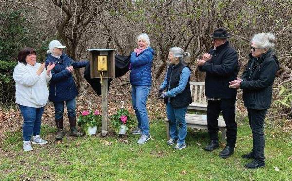 The Memorial Garden in Islip, installed a ‘Wind Phone’ to give comfort to those grieving loved ones lost to the opioid crisis. The Wind Phone was unveiled on April 21 by members of Gabriel’s Giving Tree. From left are Lori Carbonaro, Paulette Phillippe, Carole Trottere, Claudia Friszell, Charlie Limbach who constructed the phone, and his wife Grace Limbach. Photo courtesy of Gabriel’s Giving Tree