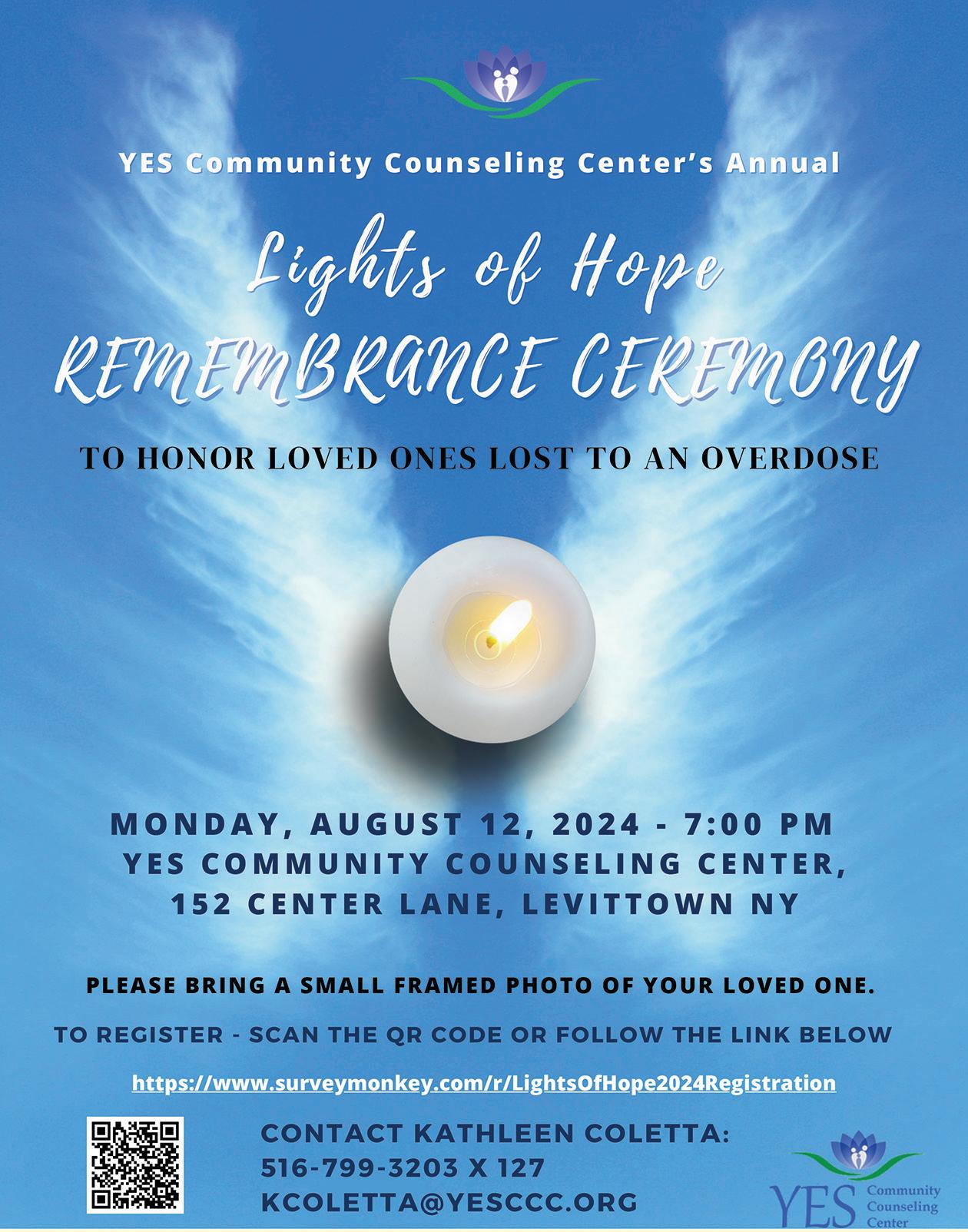 To honor loved ones lost to an overdose. YES Community Counseling Center’s Annual Lights of Hope Remembrance Ceremony is being held on Monday, August 12, 2024. The ceremony will be held at YES Community Counseling Center’s Levittown office located at 152 Center Lane. For more information, contact Kathleen Coletta, LCSW (516) 799-3203 x127 or email at kcoletta@ yesccc.org