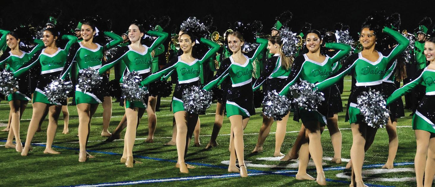 mascot. With the pep band and drumline pounding away, football team members were announced. Performances by the junior and varsity cheerleaders, the Dalerettes, and the Step-n-Dalers immediately followed.