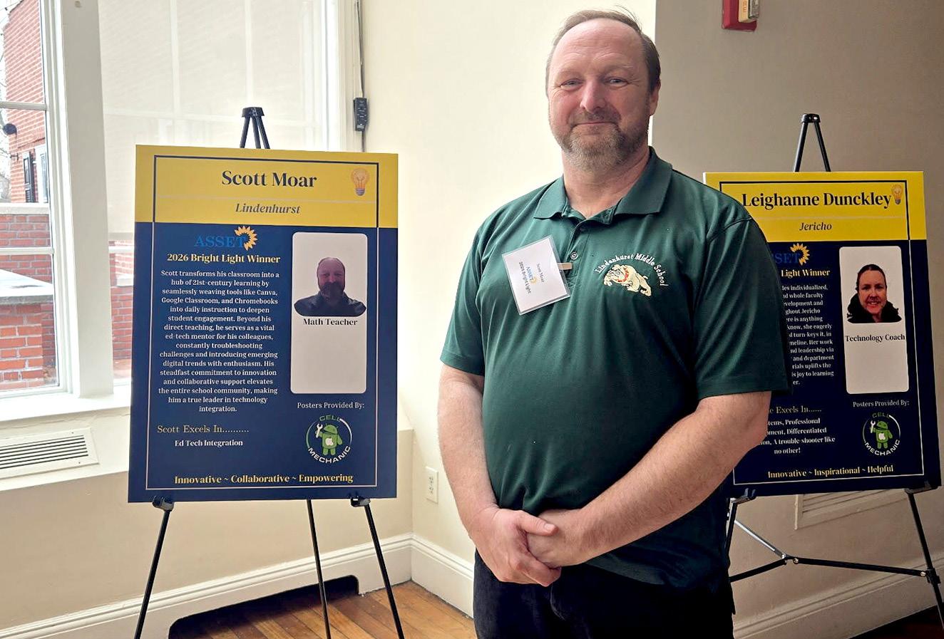 Scott Moar, a mathematics teacher at Lindenhurst Middle School, has been recognized with the ASSET Bright Light Award. The award honors educators who demonstrate innovation, leadership, and a commitment to enhancing instruction through meaningful technology integration.